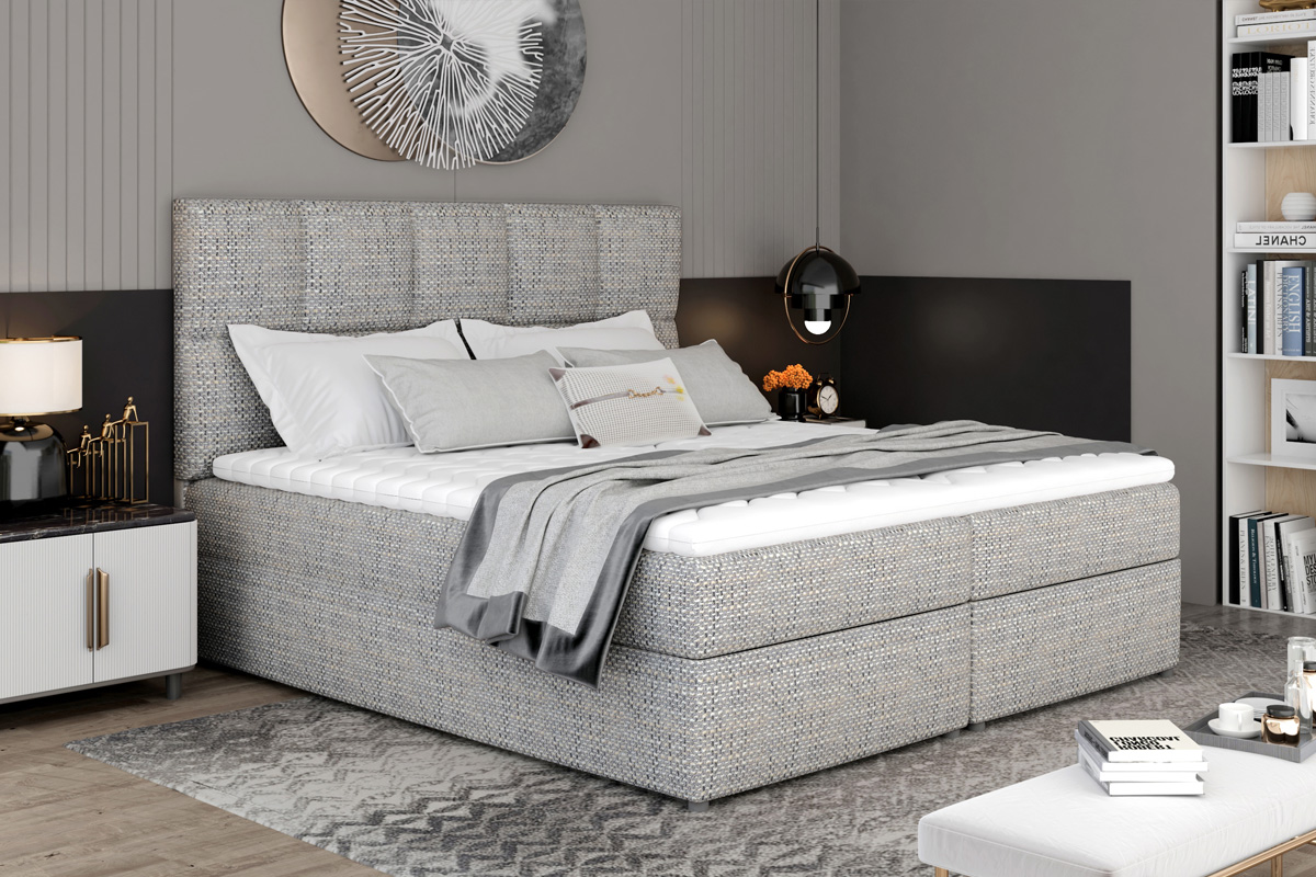 Exkluzívna a pohodlná manželská posteľ MILLY Vás hneď zaujme svojím módnym čelom. Jeho výška a jednoduchý tvar s prešívaním zabezpečí posteli elegantný a moderný vzhľad. Dokonale sa hodí do Vašej spálne, kde Vám poskytne miesto potrebné na relax a oddych.Posteľ MILLY má vysoký matrac, veľký čalúnený rám a úložný priestor. Konštrukcia postele je vyrobená v kombinácii dreva a LTD materiálu. Spacia plocha 145 x 200 poskytne dostatočne veľkú plochu pre odpočinok. Matrac má tvrdosť H3 a je tvorený kombináciou bonellových pružín a PUR peny s hustotou T25. Spolu s vrchným topperom zabezpečí pohodlnosť a uloženie Vašej chrbtice do správnej polohy. Je hypoalergénny. Posteľ je čalúnená veľmi príjemnou látkou Berlin 01.Rozmery:- šírka: 145 cm,- výška: 124 cm.- hĺbka: 210 cm.Výška matraca 15 cm, výška toppera 4 cm. Matrac a topper je v cene postele. V ponuke aj ďalšie farby čalúnenia.