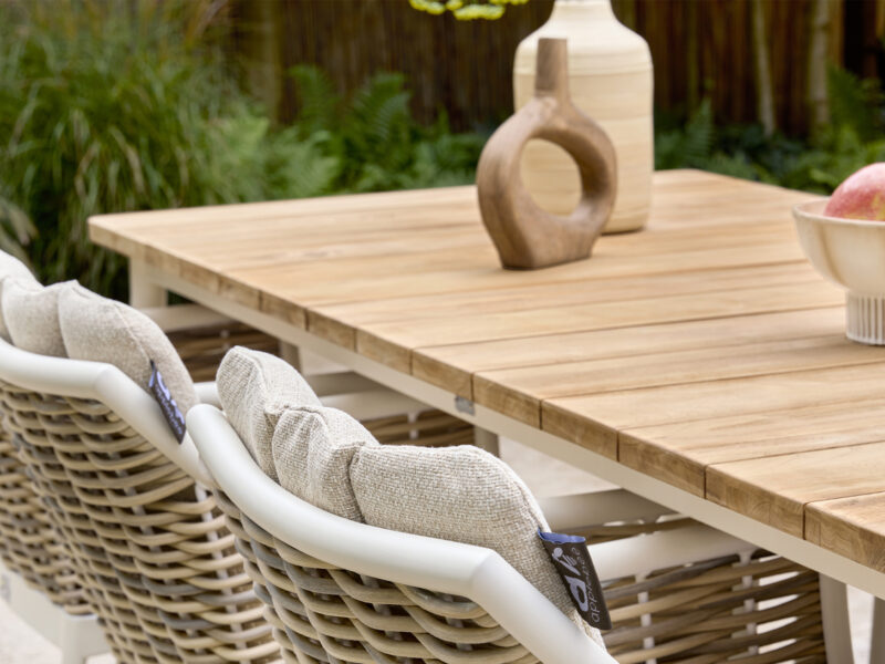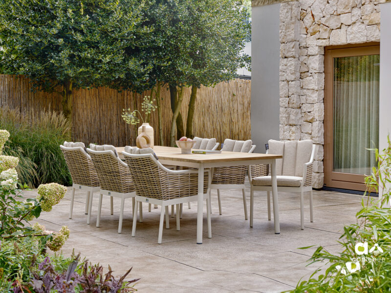 Jedálenská súprava Milou je dokonalým spojením moderného dizajnu a funkčnosti. Teaková doska stola a pevné hliníkové nohy zabezpečia stabilitu, zatiaľ čo pohodlné stoličky s výpletom prinesú štýlové stolovanie na terase či záhrade.