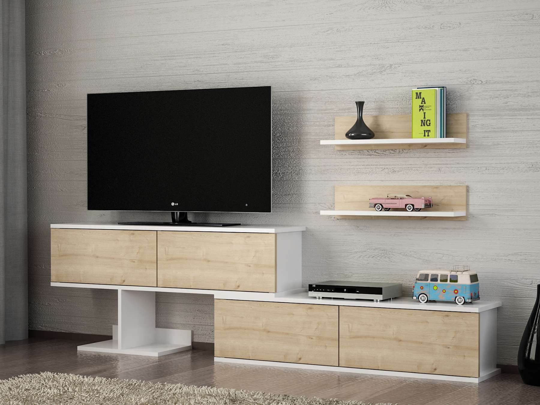 Predstavujeme MINIMUS, obývaciu stenu, ktorá kombinuje moderný dizajn a funkčnosť, aby priniesla do vašej obývačky sviežosť a eleganciu. Táto štýlová zostava v kombinácii bielej a svetlo hnedej farby je navrhnutá tak, aby poskytovala praktické a estetické riešenie pre vaše multimediálne zariadenia a ďalšie potreby.Detailné špecifikácieTyp tovaru: Obývacia stenaMateriál: Kvalitná LTD s hrúbkou materiálu 18 mm, zaisťujúca odolnosť a dlhú životnosť.Rozmery:TV stolík: 185.5-210 x 29.5 x 59 cm2x nástenná polica: 60 x 14.5 x 14.5 cmFarba: Elegantná kombinácia bielej a svetlo hnedej, ktorá dodáva priestoru moderný a príjemný vzhľad.Podrobnosti o rozmere: Výška miesta, kde bude TV: 59 cm, šírka miesta: 120 cmDodatočné informácie: Produkt je dodávaný v demontovanom stave, čo uľahčuje transport a montáž.Obývacia stena MINIMUS je ideálnou voľbou pre tých, ktorí hľadajú moderný a funkčný nábytok s elegantným vzhľadom. Jej kombinácia bielej a svetlo hnedej farby a minimalistický dizajn prináša do vášho domova sviežosť a moderný štýl, zatiaľ čo poskytujú dostatok úložného priestoru pre všetky vaše potreby.