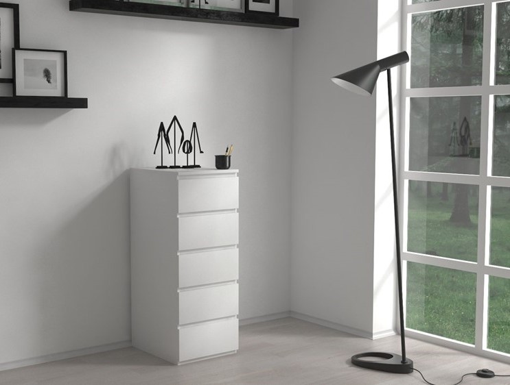 Moderná komoda 5W sa svojím jednoduchým dizajnom hodí skoro do každej miestnosti. Napriek malým rozmerom Vám poskytne dostatok úložného priestoru. Môžete ju využiť na odkladanie oblečenia, doplnkov alebo aj dokumentov. Komoda má päť zásuviek na valčekovom systéme čo zabezpečuje ich tichý chod. Je vyrobená z kvalitnej LTD dosky a hrany sú chránené ABS páskou. Komoda má bezúchytový systém otvárania, takže Vám v priestore nebudú zavadziať žiadne úchyty a zároveň to posilní jej moderný dizajn. Rozmery (ŠxVxH) : 40 x 111 x 45 cmFarebné prevedenie : bielaDodávame v demonte.