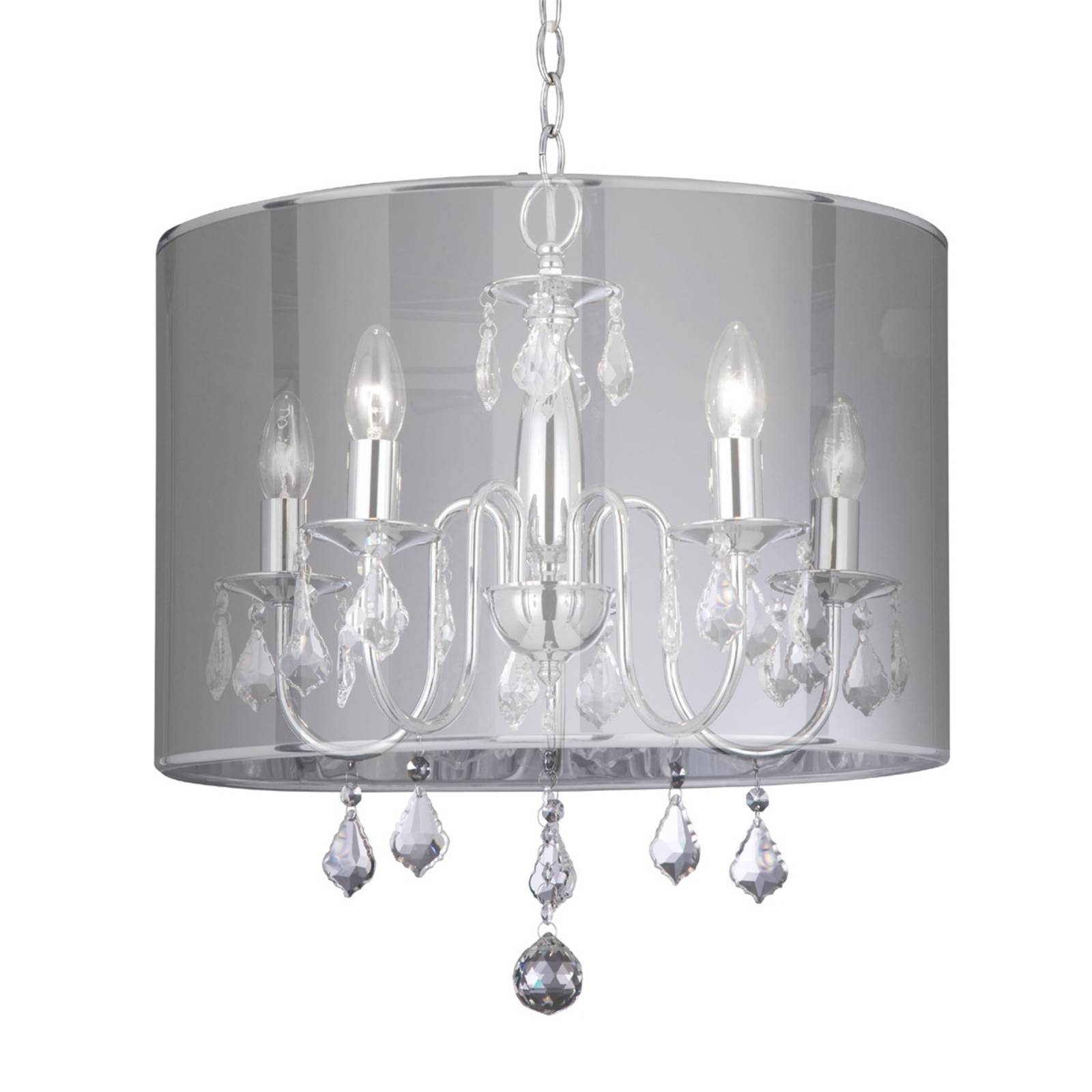 Visiaci luster OLIVIA obklopuje priesvitné tienidlo Napriek svojmu klasickému tvaru vyžaruje visiaci luster OLIVIA modernú atmosféru. Je to hlavne kvôli dizajnu rámu chrómovej farby, ktorý je doplnený početnými sklenenými krištáľmi v atraktívnom tvare kvapky. Okrem toho sa zdá, že metalízovo sfarbené priehľadné tienidlo vyrobené z pevného polykarbonátu leží okolo visiaceho lustra ako ochranný obal. Nielenže to nastavuje moderné akcenty, ale aj svetlo môže jasne a rovnomerne osvetľovať každú miestnosť.