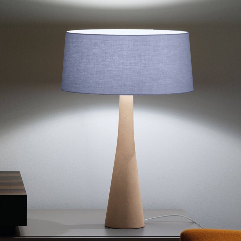 Stolová lampa Aura s béžovým betónovým podstavcom a bavlneným tienidlom v jemnej modrej farbe Prirodzený vzhľad má stolová lampa Aura v neposlednom rade vďaka krásne tvarovanej štíhlej nohe z betónu, ktorá je udržiavaná v jemnom béžovom tóne. Podstavec sa elegantne zužuje smerom hore a splýva do nepriehľadného tienidlo na lampu z bavlny, ktoré má tvar valca a umožňuje tlmené svetlo preniknúť von. Toto svetlo bez oslnenia v kombinácii so svetlou, veľmi jemnou modrou farbou textilného materiálu vytvára príťažlivé prostredie a pôsobí veľmi priateľsky. Vďaka tomu môže byť stolová lampa ľahko zabudovaná do reštaurácie alebo hotela a v každej miestnosti ponúka darčekový pútač. Ľahké ovládanie je možné kedykoľvek pomocou spínača na napájacom vedení. V betónovom podstavci sa môžu objaviť malé otvory, to sú znaky ručne vyrábaného výrobného procesu, a preto je každá žiarovka jedinečná.