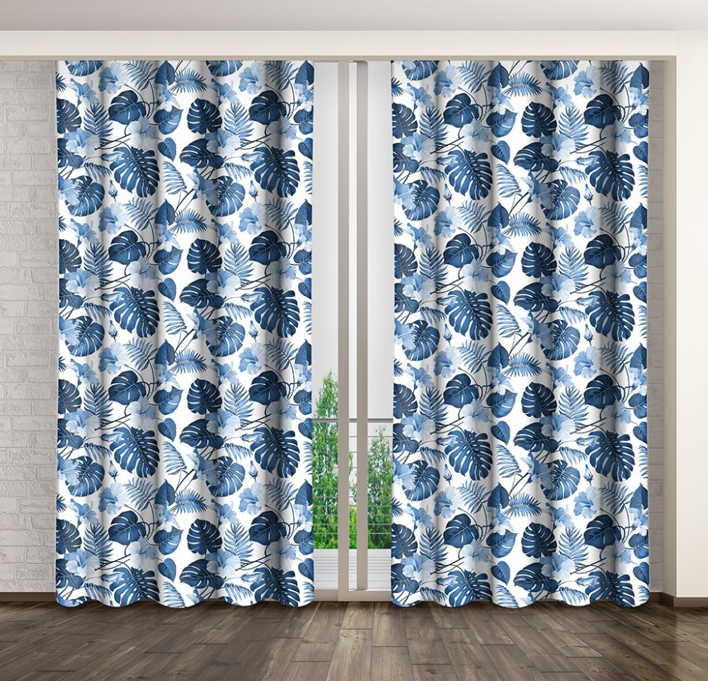 Modrý dekoračný záves s motívom listov Dĺžka: 250 cm