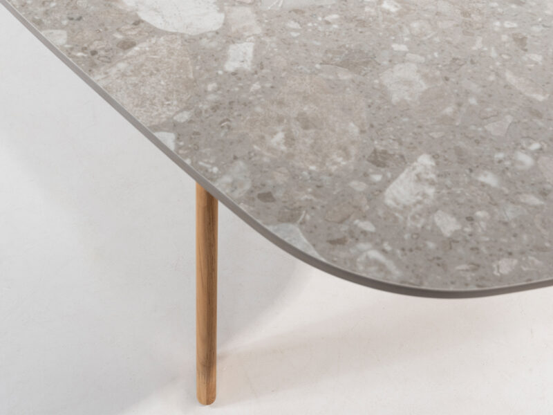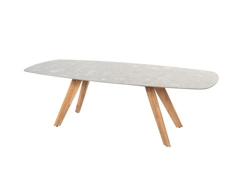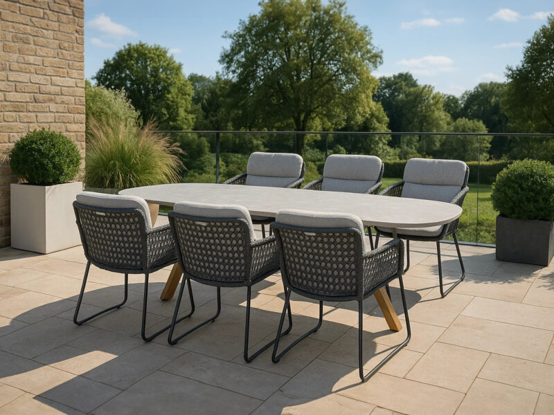 Elegantná stolová súprava s oválnym keramickým stolom Montana a šiestimi výraznými stoličkami Aprilla z Hularo prútia. Spojenie štýlového dizajnu, kvalitných materiálov a pohodlia pre vašu terasu či záhradu.