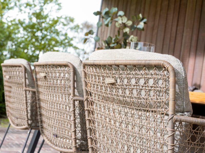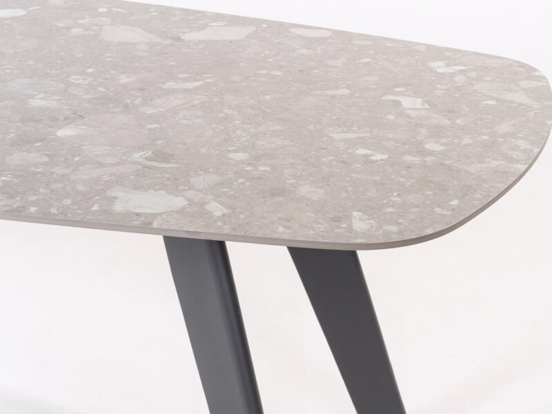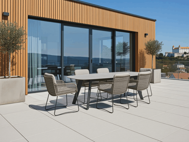 Moderná stolová súprava s oválnym keramickým stolom Montana a šiestimi pohodlnými stoličkami Aprilla s výpletom z Hularo prútia. Štýlové riešenie pre komfortné vonkajšie stolovanie s dôrazom na dizajn aj odolnosť.