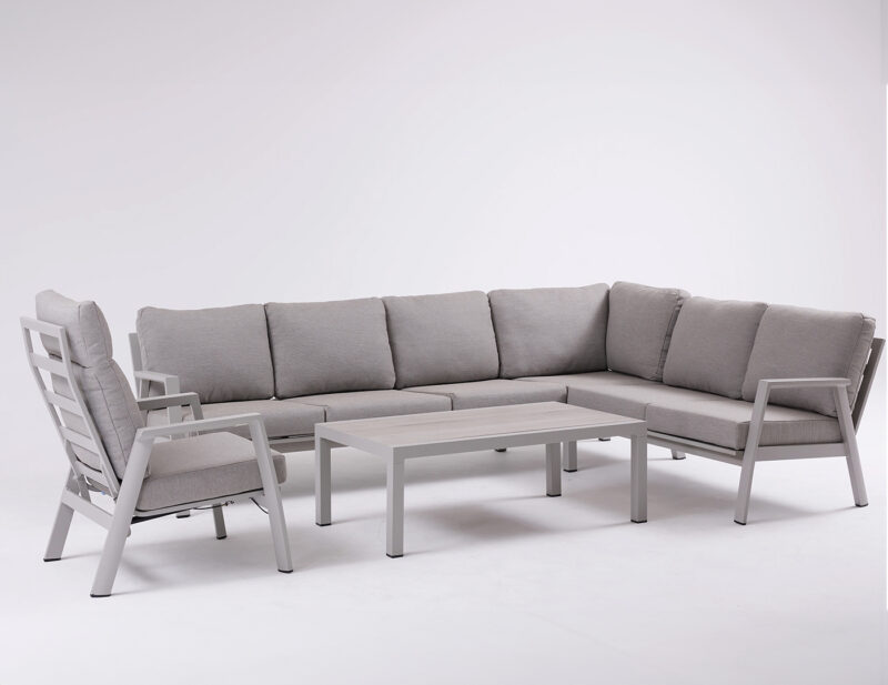 Sedacia súprava Monte Carlo ponúka priestranné a pohodlné posedenie na terasu či záhradu. Hliníková konštrukcia s odolnými poťahmi zabezpečuje dlhú životnosť, zatiaľ čo keramická stolová doska so vzhľadom dreva dodáva súprave príjemný prírodný nádych.