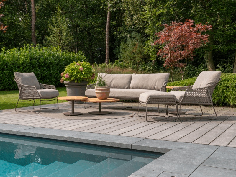Štýlová sedacia súprava s hliníkovým rámom, sivým rope výpletom a mäkkými vankúšmi s bouclé poťahom v taupe odtieni. Odolná voči počasiu, elegantná a komfortná – ideálna voľba pre váš exteriér.