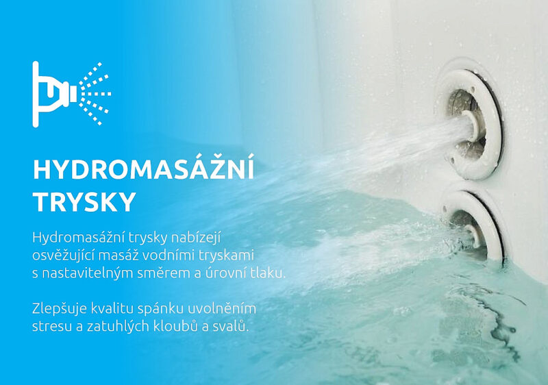 Trysky: 120 vzduchových 8 nastaviteľných hydromasážnych trysiek