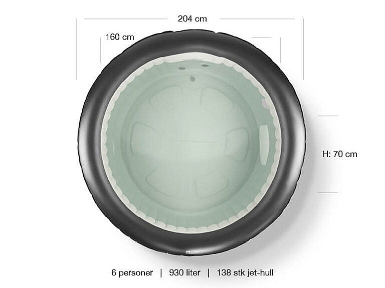 Tvar: guľatá, Šírka celkom: 2040, Výška celkom: 700, Vnútorný rozmer: 1600, Hmotnosť: 37,5, Určené pre: 6 osôb, Materiál: Premium PVC, Objem: 930, Filtrační mechanizmus: SMART filtračný systém, Filtrácia: 60 W / 1 800 l /hod, Blower: 720, Výhrev vody: max. 40°, Elektrické napätie: 220-240V / 50Hz, Rychlosť ohrevu: 1,2 – 1,8 ° C / hod, Počet vzduchových trysiek: 138, Diaľkové ovládanie: áno, Dĺžka kábla: 5, Krycia plachta: áno