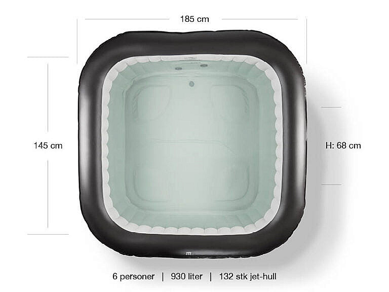Farba: šedá, Tvar: štvorec, Šírka celkom: 1850, Výška celkom: 680, Vnútorný rozmer: 1450 x 1450, Hmotnosť: 37.5, Určené pre: 6 osôb, Materiál: RhinoTech Prémiové PVC, Objem: 930, Filtrácia: 60 W / 1 800 l /hod, Blower: 600, Výhrev vody: max. 40°, Elektrické napätie: 220-240V / 50Hz, Rychlosť ohrevu: 1,5 – 2 ° C / hod, Počet vzduchových trysiek: 132, Diaľkové ovládanie: áno, Bublinky + masáž: áno, Dĺžka kábla: 5, Krycia plachta: áno