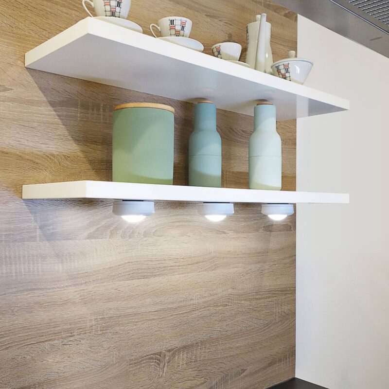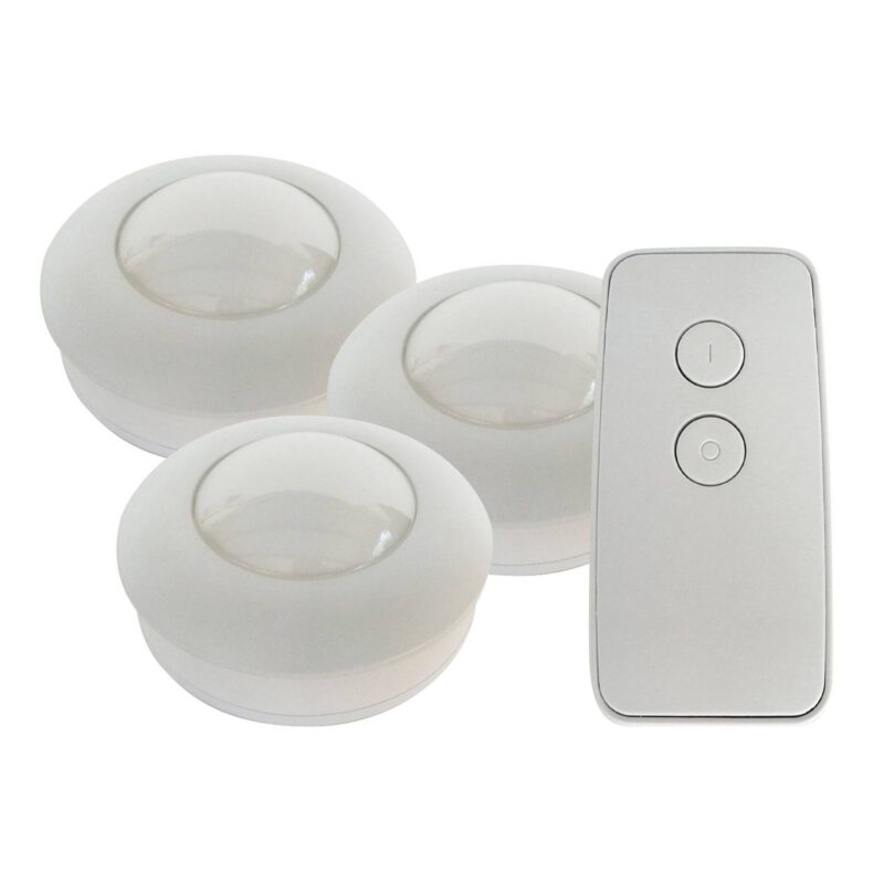 Tri batériové svietidlá Alio Push pod skrinku s diaľkovým ovládaním Tri okrúhle LED svietidlá Alio Push sa pripevňujú na skrine, police alebo iné hladké povrchy pomocou magnetických lepiacich pásikov. Sú napájané batériami a vyžadujú 9 batérií AA (sú súčasťou balenia). Tri svetlá možno zapínať a vypínať pomocou dodaného diaľkového ovládania.