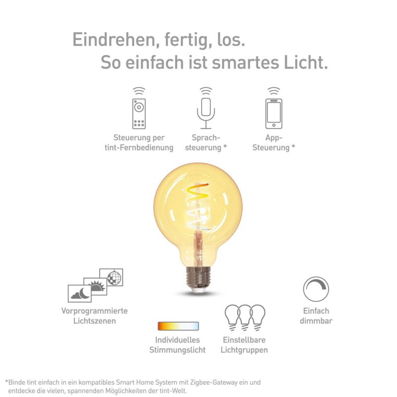 tint LED žiarovka retro zlatá E27 5,5 W G95 LED žiarovka Retro ponúka dekoratívne svetlo, ktoré sa dá ovládať inteligentným a moderným spôsobom. Farebné zlato a LED žiarovka s moderným vzhľadom sa dá pohodlne ovládať pomocou vhodného diaľkového ovládača s tint, aplikácie alebo kompatibilného hlasového asistenta. Vlastnosti / kompatibilita: – ovládateľné vhodným tint diaľkovým ovládačom, viď príslušenstvo – ovládateľné pomocou aplikácie na základe rádiového štandardu ZigBee 3.0 – Kompatibilné s hlasovým asistentom Alexa (Amazon) – Môže byť integrovaný do inteligentných domácich systémov založených na ZigBee, napríklad s Philips Hue – individuálne náladové osvetlenie v bielej farbe (1 800 až 6 500 K) – stmievateľné vo všetkých vybraných farbách svetla Poznámka: pomocou bežného nástenného vypínača sa nedá stlmiť. Iba vhodným diaľkovým ovládaním, cez aplikáciu alebo hlasovým ovládaním.