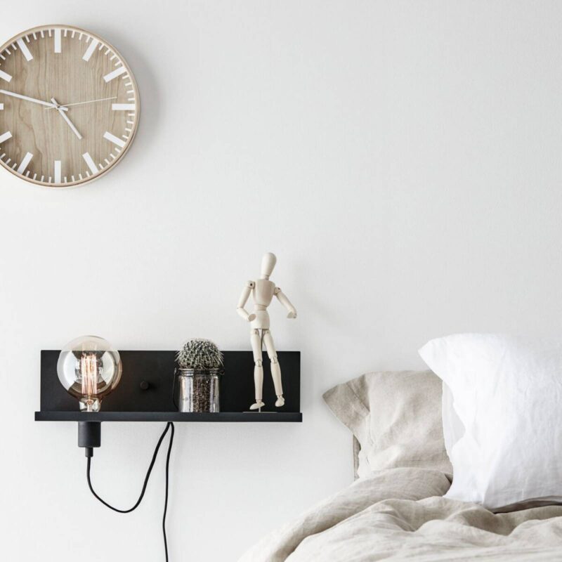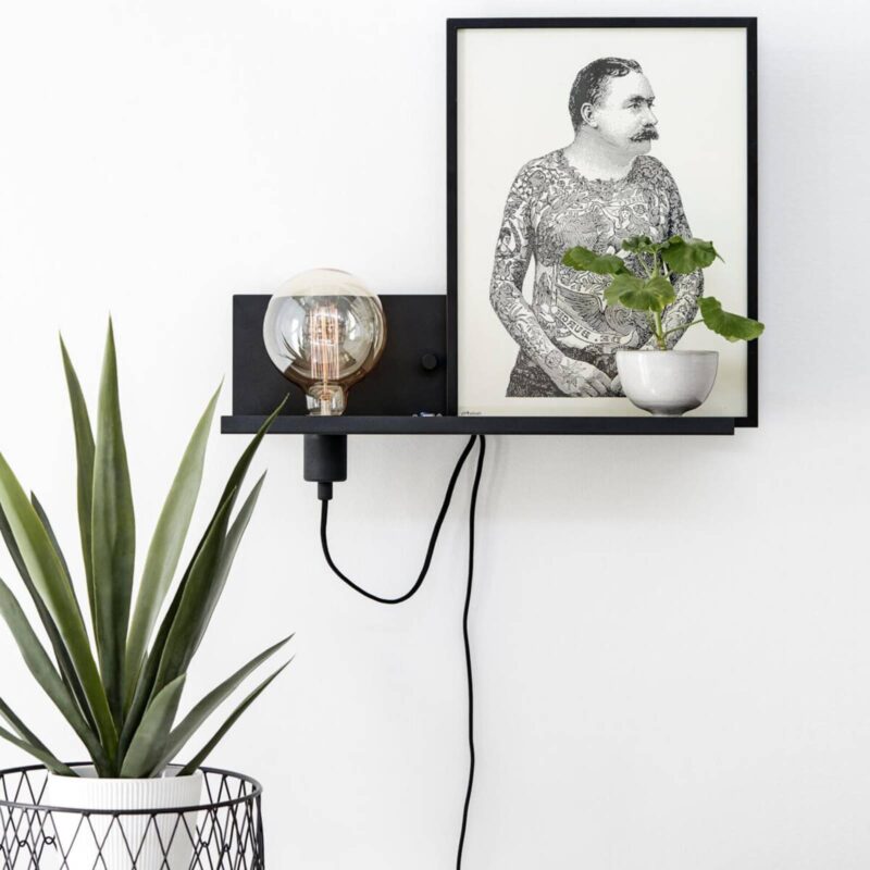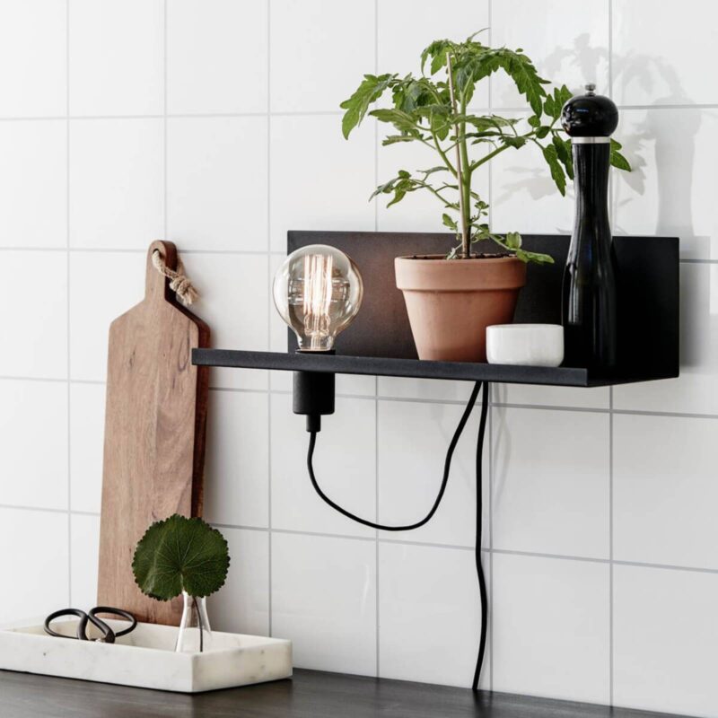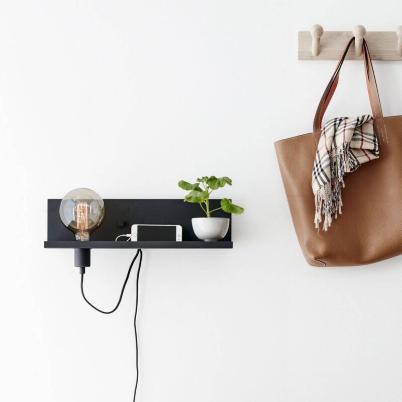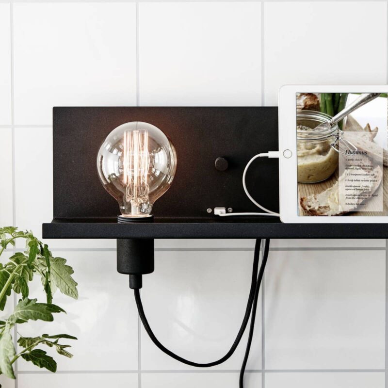 Multi USB – multifunkčné nástenné svietidlo s nabíjacím portom USB, otočným stmievačom a poličkou Moderný dizajn nástenného svietidla Multi USB je, ako už názov napovedá, vybavený praktickým nabíjacím portom USB a v kombinácii s poličkou uľahčuje nabíjanie mobilného telefónu alebo tabletu. Na poličku však možno uložiť nielen mobilné telefóny alebo tablety, ale aj mnohé iné predmety, napríklad knihy alebo časopisy. Vďaka tomu, že zdroj svetla je úplne viditeľný, pôsobí dizajn veľmi minimalisticky a nadčasovo. Obzvlášť originálne vyzerá, keď sa do objímky E27 zaskrutkuje stmievateľná guľová žiarovka. Možno však použiť aj bežné žiarovky alebo LED žiarovky. Súčasťou je otočný stmievač a 2 m kábel so zástrčkou.