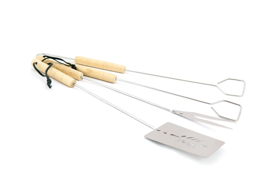 Grilovacie náradie AE182 je 3-dielna súprava na grilovanie. Sada náradia s drevenými úchytmi obsahuje grilovaciu vidlicu, lopatku a kliešte na otáčanie mäsa.