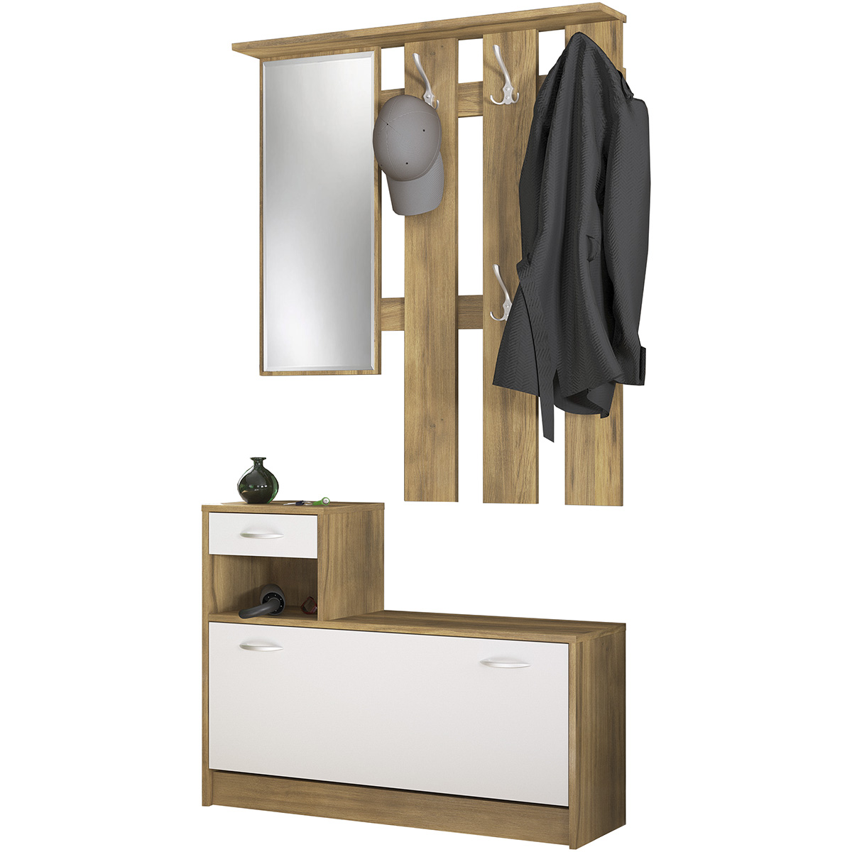 Predsieň so zrkadlom OIKOS HS je moderná zostava, ktorá je tvorená praktickým vešiakovým panelom so zrkadlom, botníkom s vyklápacími dvierkami a zásuvkou. Dvierka aj zásuvka disponujú pre jednoduchšiu manipuláciu so striebornými úchytkami. Materiál použitý na výrobu je kvalitná drevotriesková…