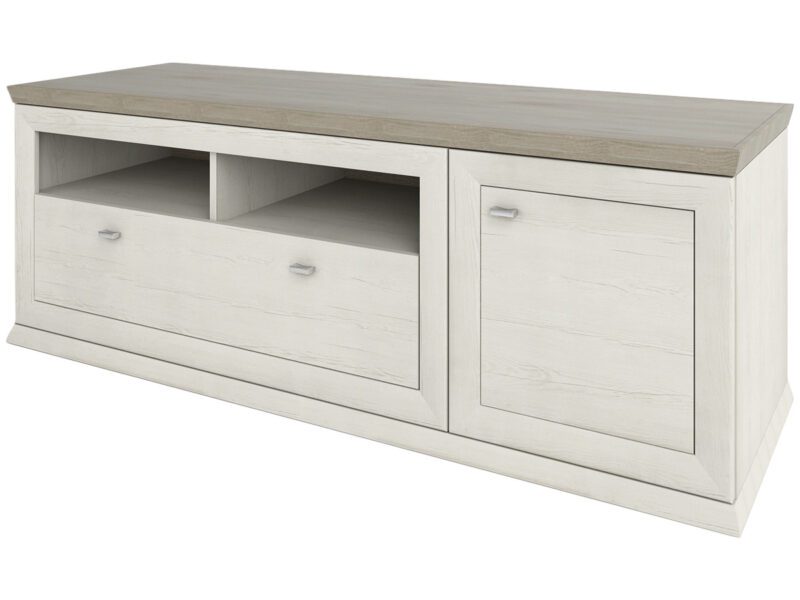 TV stolík ORENTANO TV-E-1502-1D/1DR vnesie do Vášho domova kúsok provensálskeho vánku. Rozmery stolíka sú (ŠxHxV): 150,2×50,1×55,4 cm. Nábytok z kolekcie Orentano je zhotovený z kvalitných materiálov ako sú DTD (drevotriesková doska) a MDF (drevovláknitá doska). Hrúbka pevného korpusu drevotriesky…