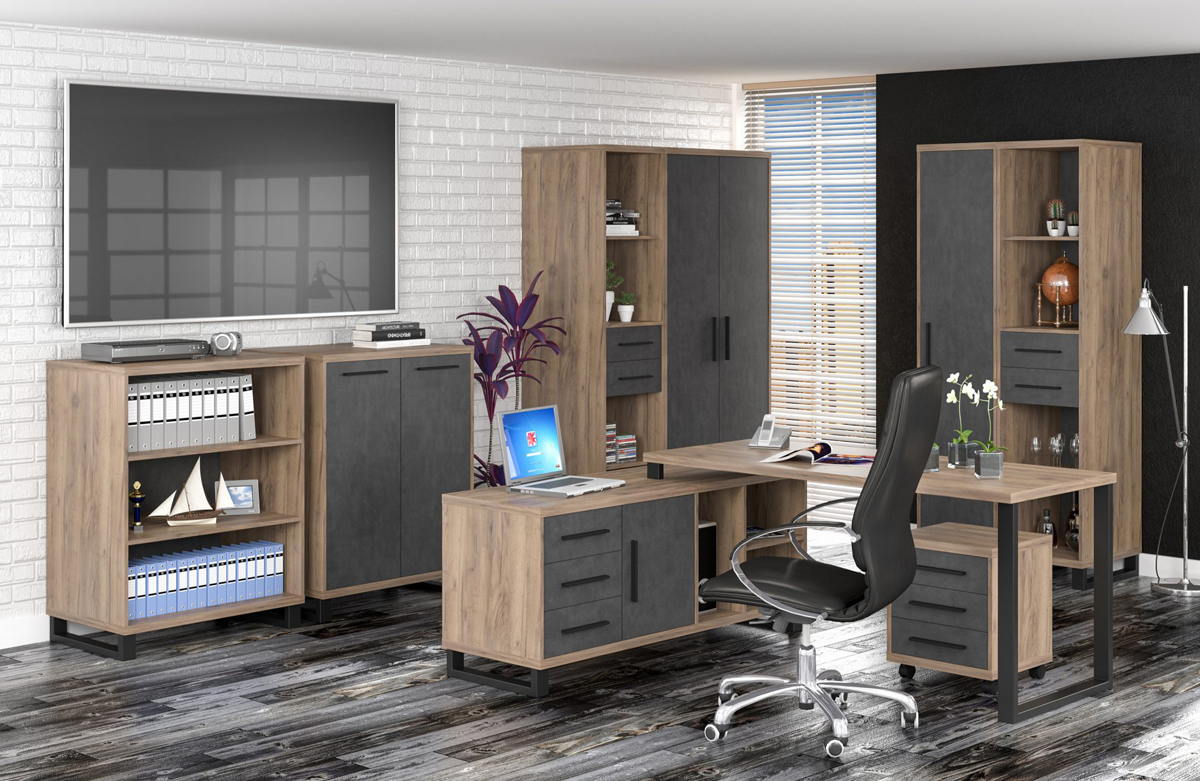 Pracovňa Ovida je moderný nábytok do interiéru, ktorý sa vyznačuje svojou tmavou farbou a jedinečným dizajnom. Tento produkt je vyrobený z aglomerovaného materiálu DTD, ktorý je známy svojou odolnosťou a dlhou životnosťou. Hlavné farebné prevedenie je dub, doplnené o sekundárnu sivú farbu.