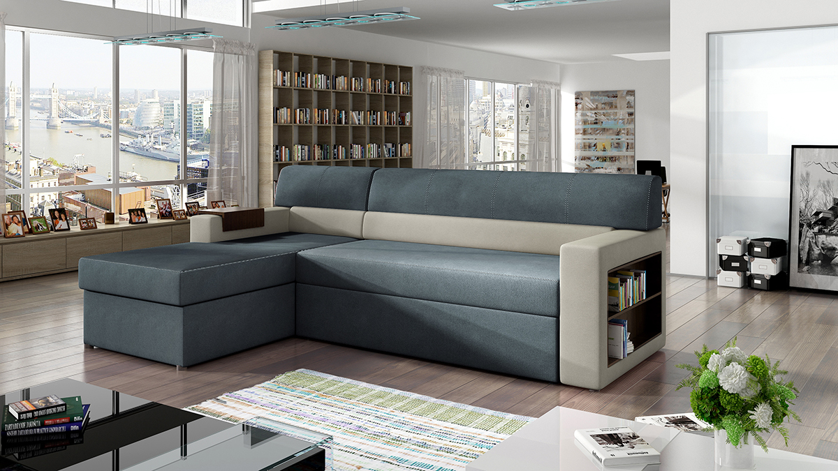 NABBI Rieti L rohová sedačka s rozkladom a úložným priestorom modrá / svetlosivá