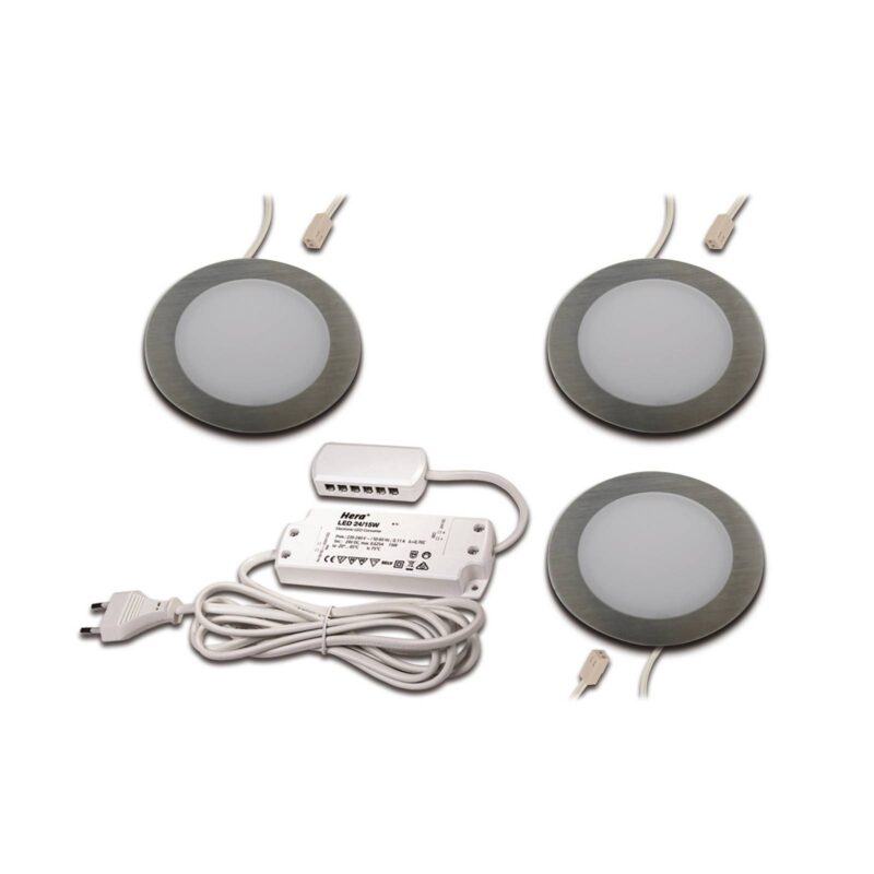 Okrúhle, stmievateľné nábytkové svietidlo FAR 58 LED v sade 3 kusov pripravenej na pripojenie FAR 58 je nábytkové svietidlo s okrúhlym rámom v nerezovom vzhľade a plastovým difúzorom, ktoré sa dokonale hodí do moderného prostredia a možno ho použiť aj v kúpeľniach a umyvárňach. Tri svietidlá v sade sú vybavené pripojovacími káblami; súčasťou dodávky je transformátor potrebný na prevádzku na pripojenie do zásuvky. V prípade potreby je možné stmievanie pomocou externého ovládača (nie je súčasťou dodávky) – Dodáva sa v sade 3 kusov s LED transformátorom (230 V na 24 V) so sieťovou zástrčkou – Veľmi dobré podanie farieb: CRI > 90 – Vybavené 250 cm dlhým pripojovacím káblom (zástrčka Hera LED 24) – Minimálna vzdialenosť od susedného svietidla: 5 cm