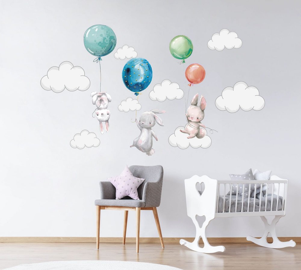 Nálepka na stenu so zajačikmi a farebnými balónmi 76 x 200 cm