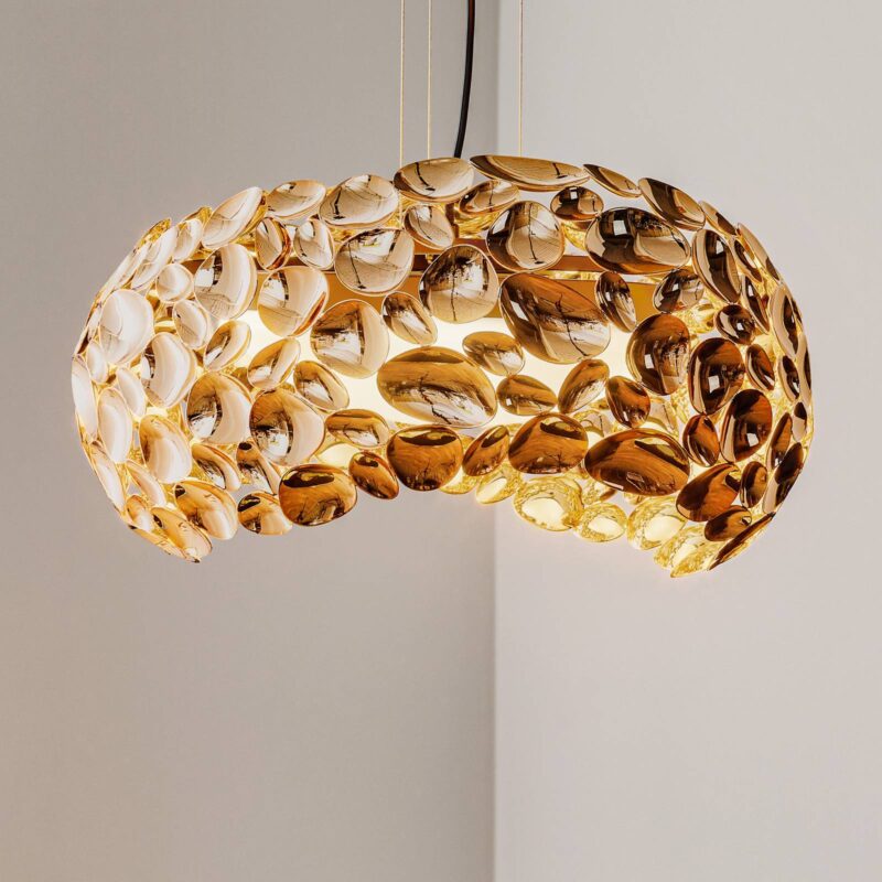 Fascinujúco navrhnuté závesné svietidlo Narisa LED Mnohé kovové prvky, ktoré tvoria tienidlo závesného svietidla Narisa LED, majú tvar veľkých a malých lyžíc a sú ružovozlatej farby. Vo vnútri sa nachádza akrylový difúzor, ktorý homogenizuje svetlo vyžarované integrovanými LED žiarovkami (G9) a smeruje ho nadol. Svetlo smeruje do okolia aj cez množstvo medzier medzi prvkami. Odraz svetla a odlesky navyše vytvárajú veľmi atmosférický svetelný efekt. Závesné svietidlo, ktoré pôsobí ako ambientné osvetlenie v miestnosti, ako aj ako zdroj svetla nad jedálenským stolom.