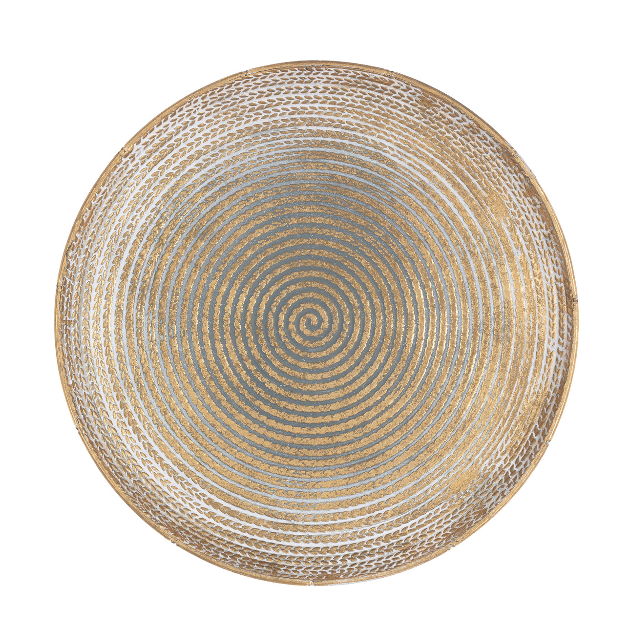 Okrúhla kovová dekorácia na stenu so zlatým dekorom.