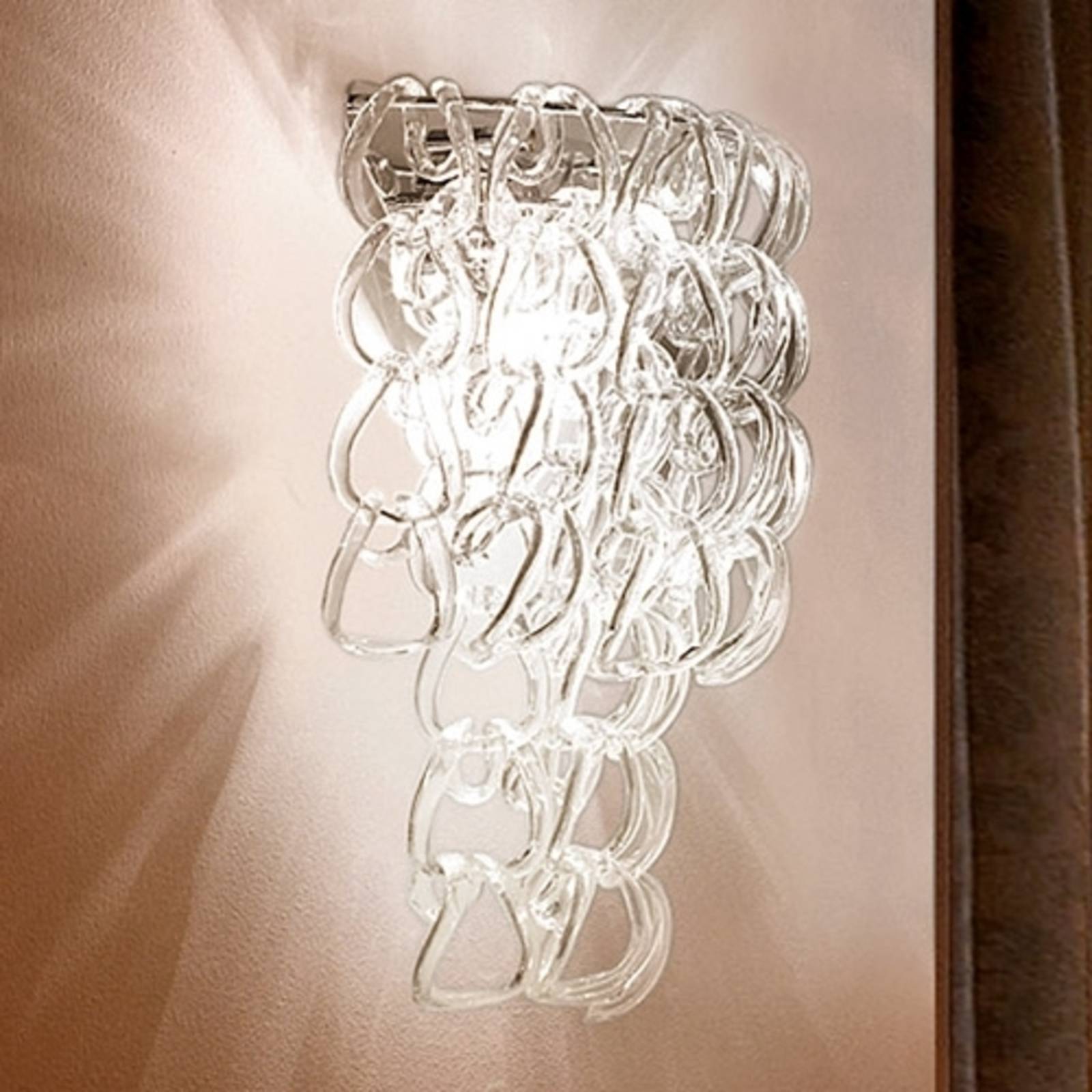 Rozkošná nástenná lampa GIOGALI zdobená krištáľovým sklom Nástenná lampa GIOGALI postará o žiarivé okamihy v obytných alebo jedálenských priestoroch. Lampa boduje špeciálnym dizajnom, pretože hlavnou pozornosťou je spôsob spájania jemných prvkov z krištáľového skla, ktoré prechádzajú dole akoby zapletené z nástenného držiaka. Vhodná na LEDS alebo energeticky úsporné žiarovky. Keď sa svetlo rozsvieti, odráža a zrkadlí sa cez krištáľové sklo a vytvára pôsobivé svetelné efekty. Elegantne zvýši GIOGALI vizuálnu príťažlivosť hotelov a reštaurácií a hlboké doplnkové osvetlenie. Výrobca, ktorý v Taliansku vyrába už od roku 1952 používa na svoje výrobky vyberané muranské sklo. Rodinná história zakladateľa spoločnosti pritom siaha až do 16. storočia. Už vtedy sa stal sklársky priemysel tradíciou, na ktorú sa ešte aj v súčasnosti kladie veľký dôraz. Spoločnosť zároveň spolupracuje s modernými dizajnérmi, ako je Angelo Mangiarotti. Vznikajú tak zdroje svetla do súkromných a komerčných priestorov, ktoré ponúkajú pridanú hodnotu a dávajú mnoho aj vizuálne. – s ručne fúkaným, viacvrstvovým sklom