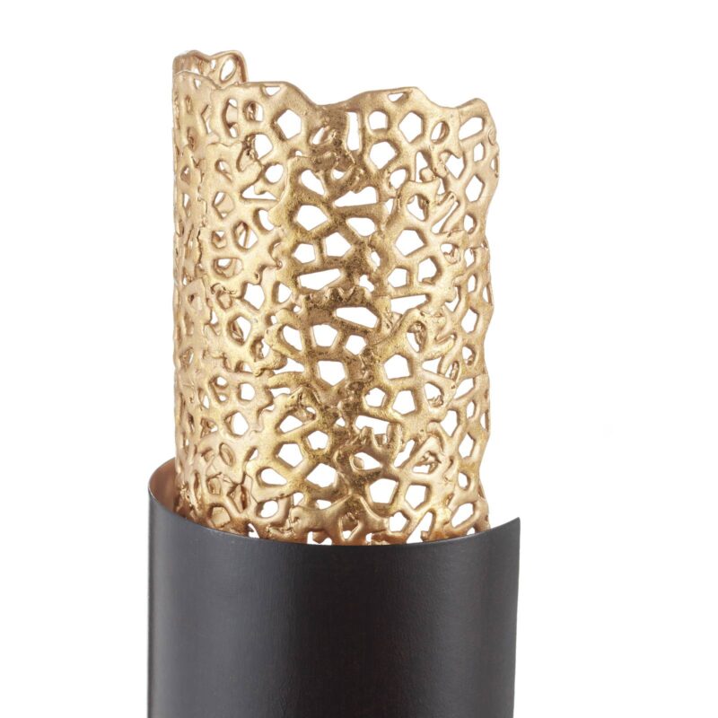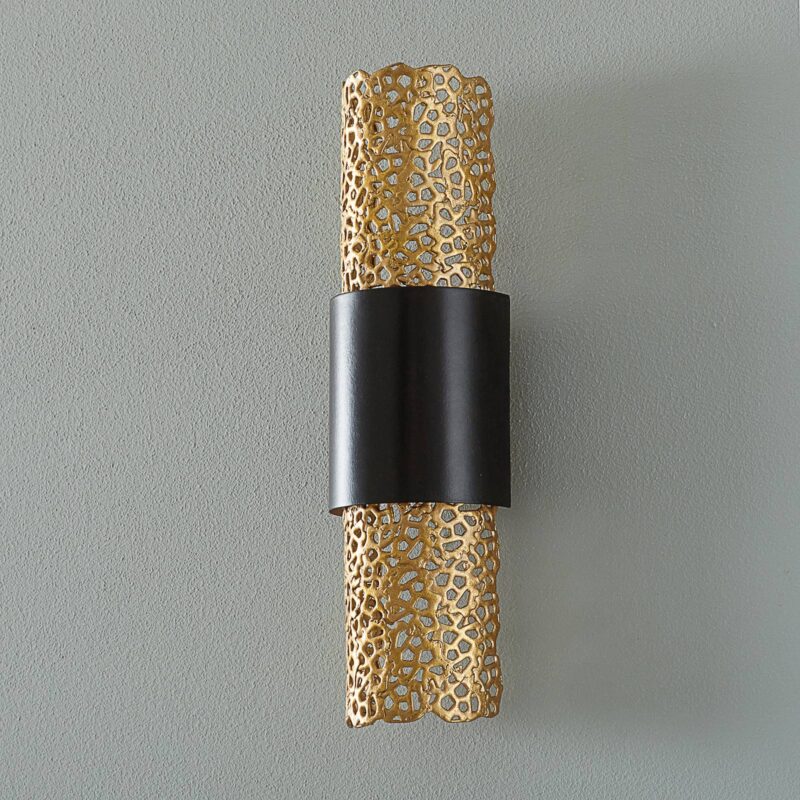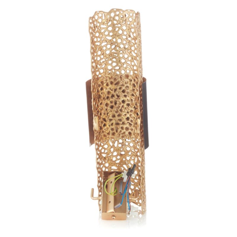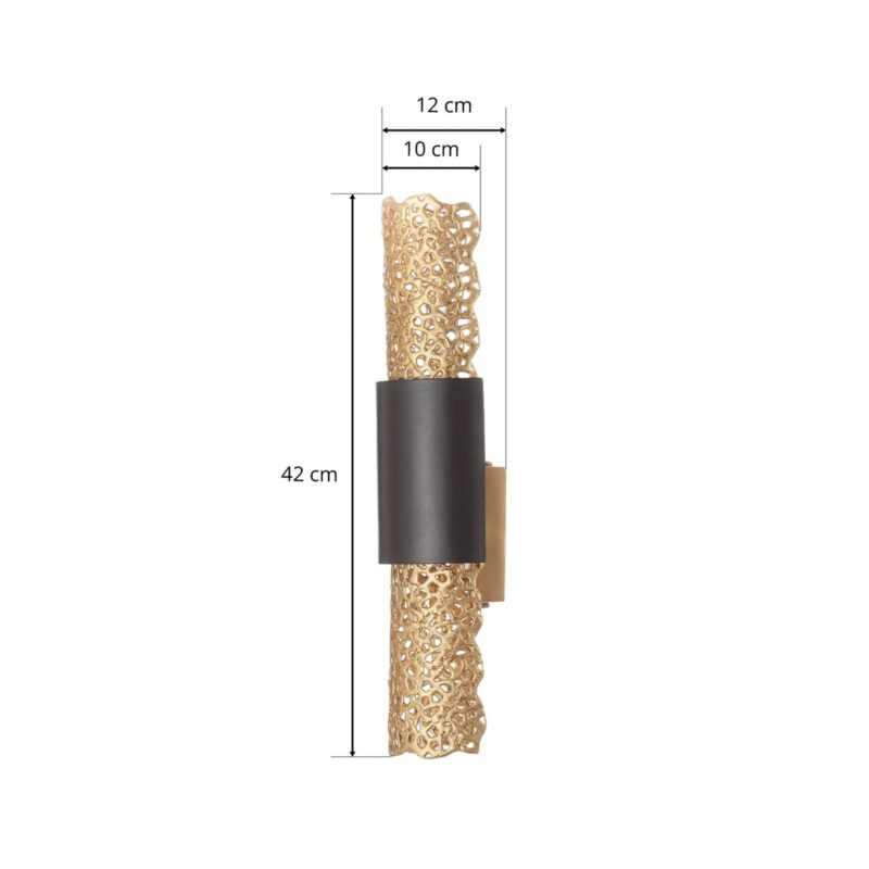 Nástenná lampa Palazzo na pozdĺžnu a bočnú montáž Tienidlo nástennej lampy Palazzo je vyrobené zo železnej siete zlatej farby vytvarovanej do trubice, s hnedým tienidlom v strede. Vzor na tienidle vytvára na stene veľmi pôvabné svetelné akcenty. Palazzo sa môže namontovať pozdĺžne aj priečne a hodí sa najrôznejším štýlom bývania.