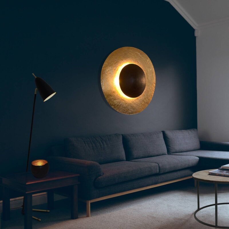 Nástenná lampa SATELLITE 2 – neobvyklý zdroj svetla pre individuálny vkus bývania Naozaj nevšedne navrhnutá nástenná lampa SATELIT 2 lampy zo zlata a hnedého železa vyvoláva dojem, že sú to dve kozmické telesá, z ktorých jedno svieti v tieni toho druhého.