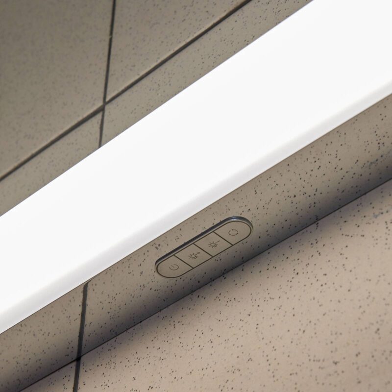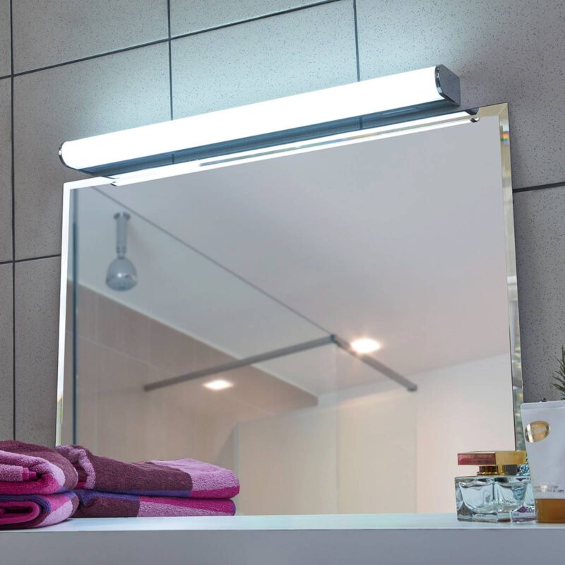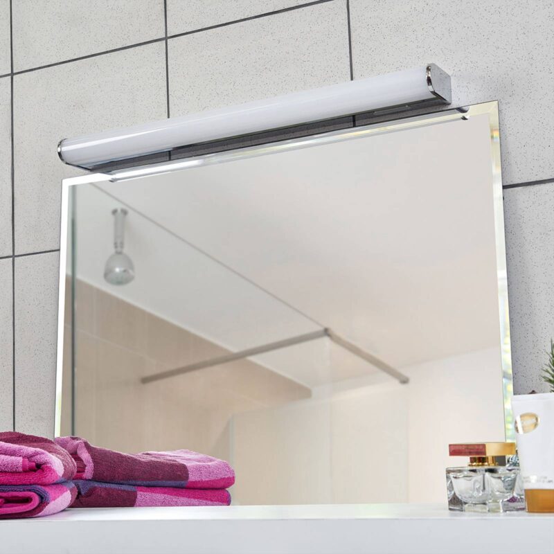 LED nástenné svietidlo Jesko určené do kúpeľne s variabilnou farbou svetla a stmievačom LED nástenné svietidlo Jesko je jednoduchých tvarov a jeho predná strana je decentne zaoblená. Pochrómovaný rám sa spája s krytom z mliečneho bieleho akrylu, ktorý cloní svetlo jasne svietiacich LED, vďaka čomu pôsobí rozptyľované svetlo veľmi rovnomerne. Stmievač sa nachádza priamo na svietidle a umožňuje presné nastavenie jasu, pričom možno nastaviť aj farbu svetla v rozsahu teplej bielej, univerzálnej bielej a denného svetla. V neposlednom rade disponuje LED nástenné svietidlo stupňom ochrany IP44, vďaka ktorému ho možno pokojne používať aj v kúpeľni, keďže je dobre chránené pred vlhkosťou. LED nástenné svietidlo možno ovládať výlučne pomocou integrovaného spínača.