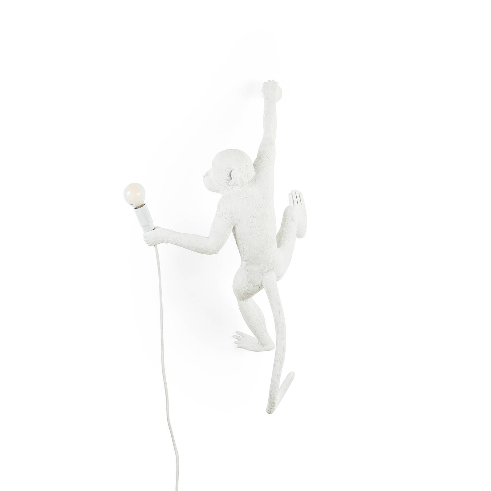 Deco nástenné svietidlo Monkey Lamp – postava opice visiaca na pravej ruke so žiarovkou E14Monkey Lamp je predovšetkým kreatívny dekoratívny predmet na použitie v interiéri. Postavička opice, ktorá je vyrobená zo syntetickej živice, sa drží na nástennej montáži pravou rukou. V ľavej ruke drží opička zásuvku E14 s káblom, ktorá je vybavená LED žiarovkou.- stupeň ochrany: IP20- vybavená zástrčkou s káblom a vypínačom- dizajn: Marcantonio