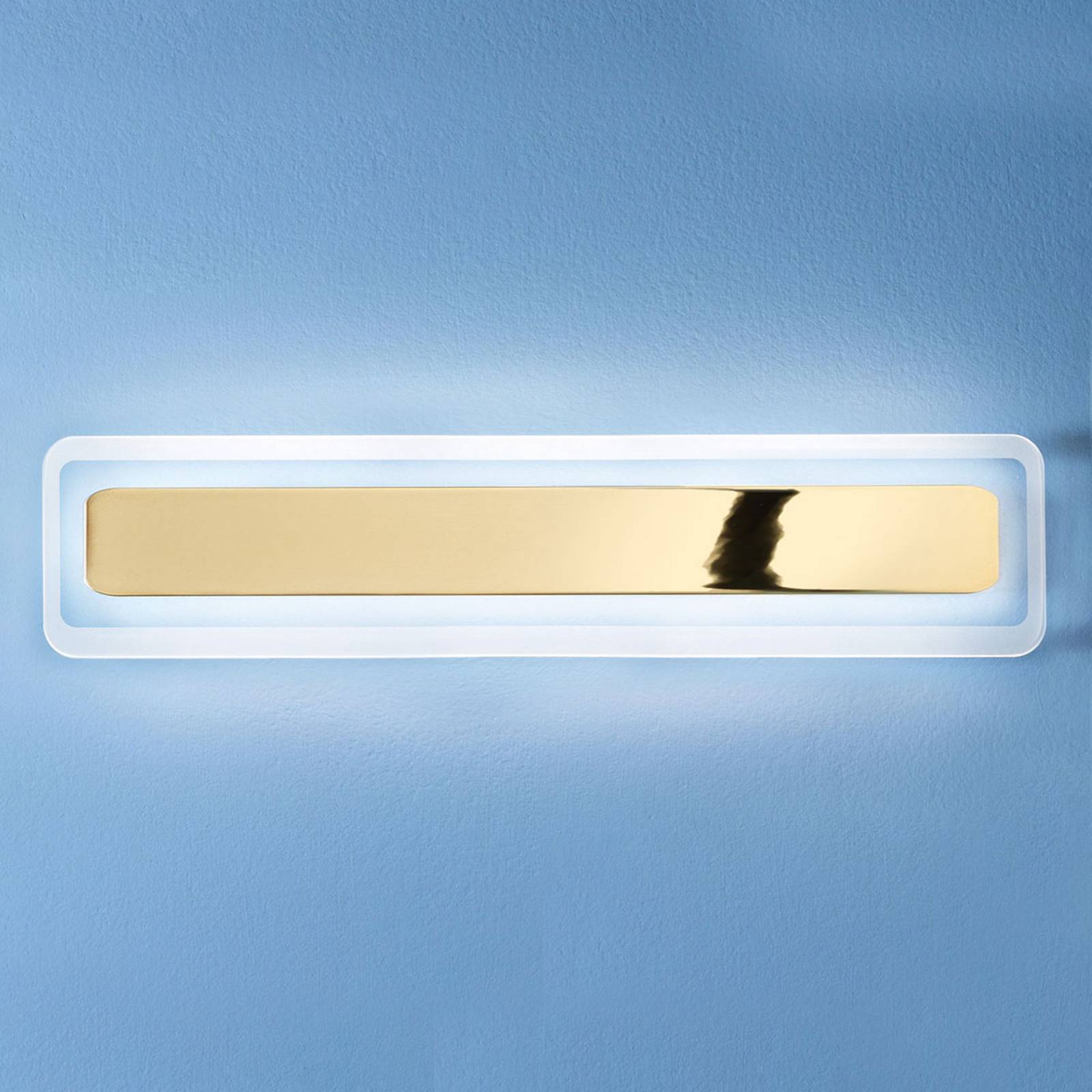 Zlaté LED nástenné svetlo Antille Toto nástenné a stropné svietidlo je výsledkom súčasných výrobných postupov. Zatiaľ čo vonkajšia časť skleneného difúzora získava matný vzhľad pieskovaním, centrálne železné telo je pozinkované zlatom. Oba majú tvar zaobleného obdĺžnika. Teplé biele svetlo LED diód ukrytých za železným telom poskytuje príjemné základné osvetlenie, vďaka čomu je závesné svetlo Antille elegantným nepriamym zdrojom svetla pre moderné obytné priestory.