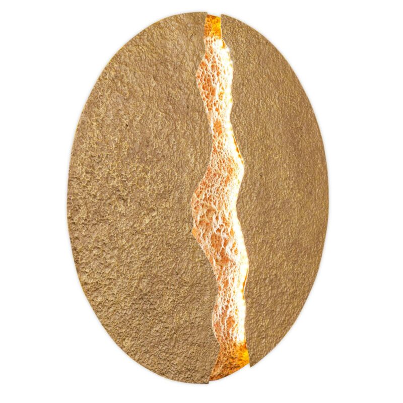 Pôsobivé LED nástenné svetlo Eruption v zlato-oranžovo-červenej farbe Erupcia – názov tejto nádhernej nástennej lampy presne vystihuje jej vzhľad. Veľký železný disk so zlato zafarbeným kladivovým povrchom je v strede krížený nepravidelne tvarovaným oranžovo-červeným pruhom, takže vyzerá, akoby vybuchla sopka. Ako zdroj svetla je nainštalovaný energeticky efektívny pás LED, ktorý osvetľuje okraj žiarovky aj stredový pás. – externe stmievateľné