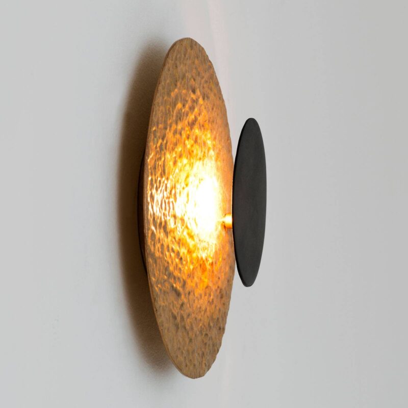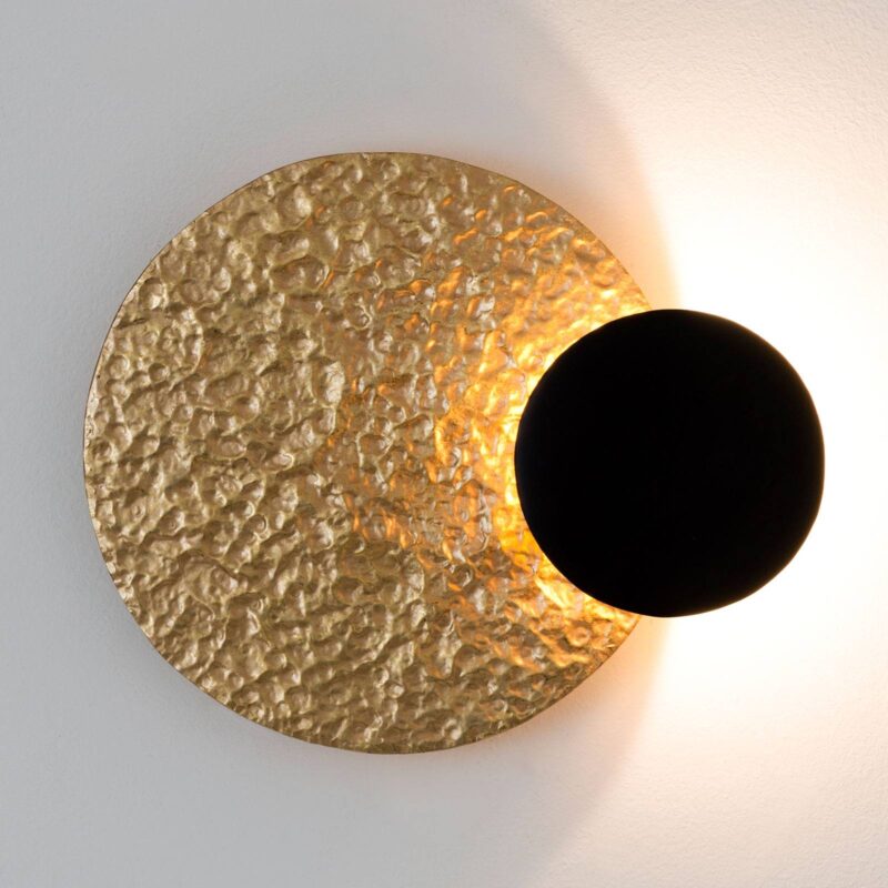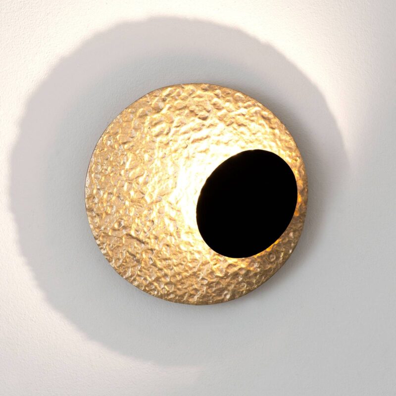 Kruhové LED nástenné svetlo Infinity pre ďalšie dekoratívne osvetlenie Nástenné svietidlo Infinity LED ponúka zaujímavú súhru lesku, štruktúry a svetla. Jeho hlavným prvkom je zadný okrúhly disk vyrobený zo zlatého železa, ktorý má nepravidelný vzor priehlbín. LED diódy za predným, hnedočiernym prvkom osvetľujú zadný kruh a zdôrazňujú jeho pulzujúci lesk. Infinity je preto ideálny na dekoráciu a ako doplnkový zdroj svetla v obývacej izbe a obývacej časti.