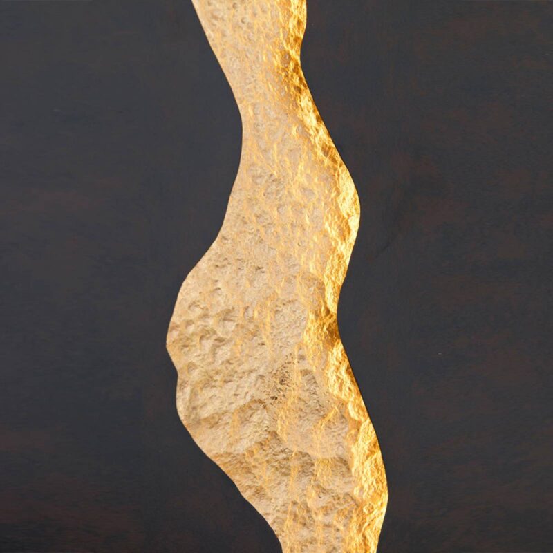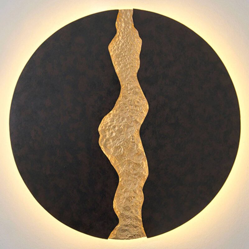 Okrúhle LED nástenné svietidlo Lava s nepriamym osvetlením Energeticky efektívny LED svetelný zdroj s nepriamym vyžarovaním svetla, ako aj pôsobivý dekoratívny predmet – to je nástenné LED svetlo Lava. Skladá sa z veľkého hnedočierneho železného disku, ktorý je v strede rozdelený zlátovaným tepaným pásom. Dojem vzniká žeravým uhlíkom uprostred tečúcej lávy. Tento dojem zdôrazňuje nepriame LED osvetlenie, ktoré obklopuje svietidlo ako celok a zdôrazňuje prvok v zlatej farbe. – externe stmievateľné