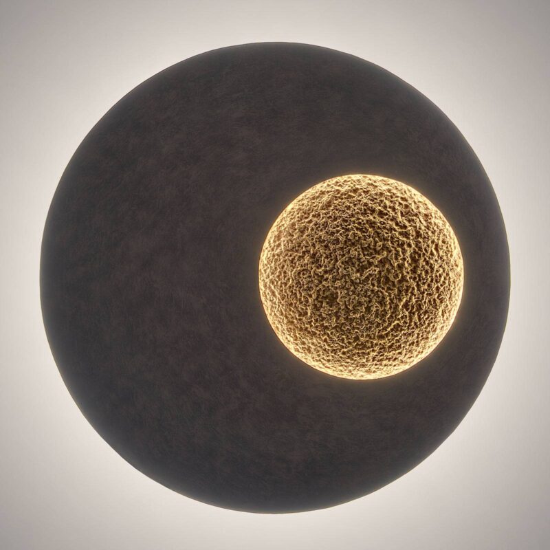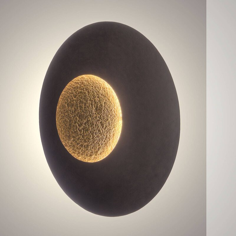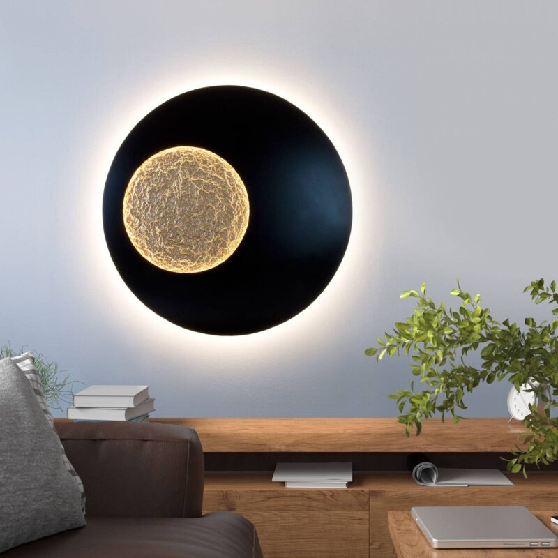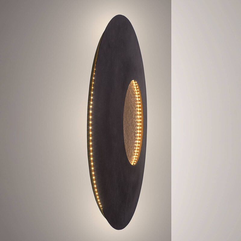 Nástenné svietidlo Luina zo železa v čierno-zlatej farbe Fascinácia Mesiacom je v nástennom svietidle Luina interpretovaná moderným spôsobom. Vzrušujúco navrhnutá lampa podčiarkuje koncept osvetlenia na mieste moderným elegantným spôsobom a inšpiruje príjemným tokom svetla. Malý zlatý disk zo železa svieti štruktúrovane zvnútra na väčší železný disk v hnedočiernom tienidle. Vďaka tomu má lampa príťažlivý dizajn nočnej oblohy. Vnútorný kotúč sa dá flexibilne namontovať na vonkajší prvok. Nástenné svietidlo LED nepriamo rozptyľuje svetlo a zároveň je exkluzívnym doplnkom v útulnom domove.