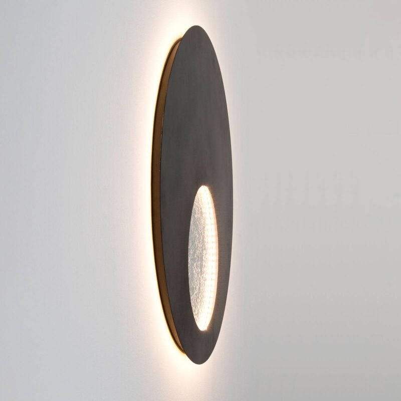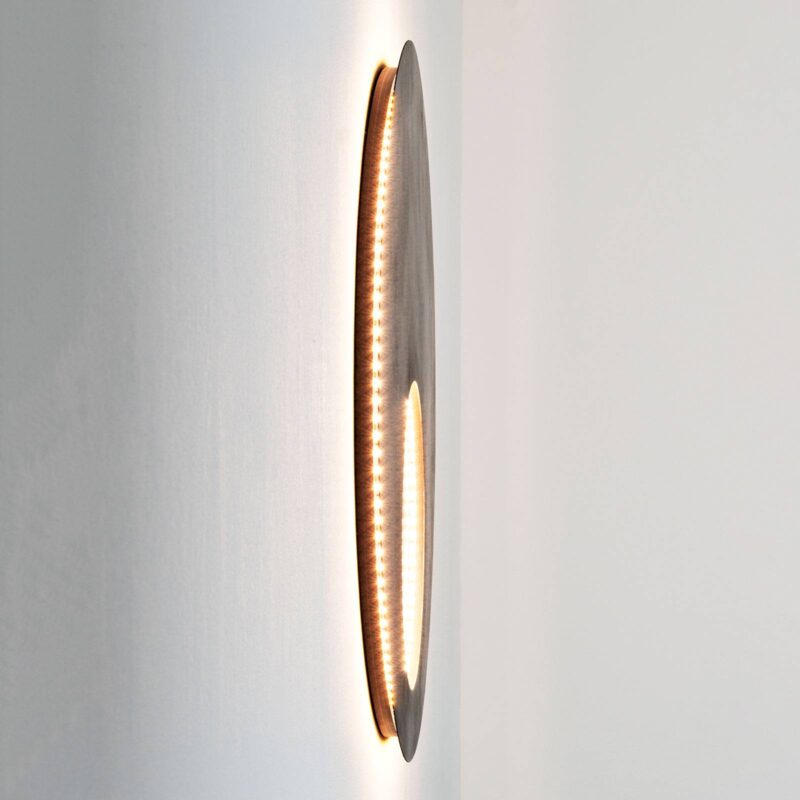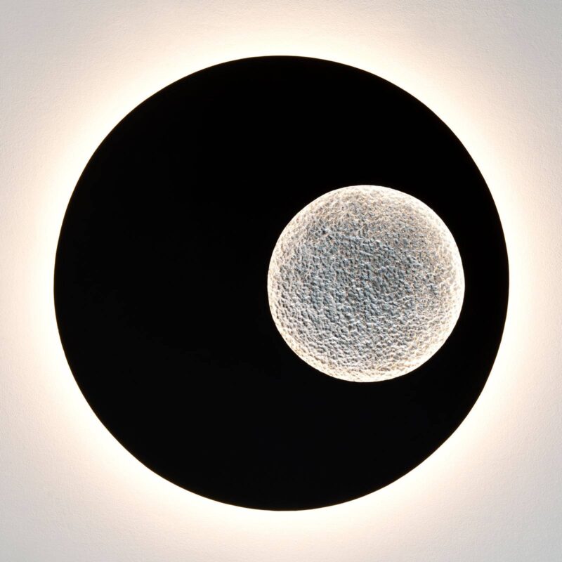 Čierno-strieborné nástenné svietidlo Luina z kovu Nástenné svietidlo Luina je štýlovým pútačom pozornosti a poteší vysokou kvalitou. Vďaka použitým farbám doplní Luina každý štýl interiéru nepriamym svetlom pre pohodu. Okrúhly disk nástenného svietidla LED je vyrobený zo železa v čiernej a hnedej farbe. K nemu je pripojený menší strieborný kovový disk so štruktúrou krátera, ktorý pripomína mesiac. Ten sa dá podľa potreby namontovať na väčší prvok. Osvetľovacie teleso je umiestnené za okrúhlymi kovovými prvkami, a preto ideálne rozptyľuje svetlo. Neobvyklý dizajn prináša Mesiac štýlovo a vzrušujúco do domácnosti.