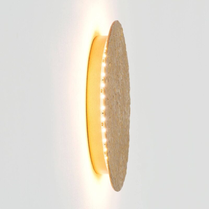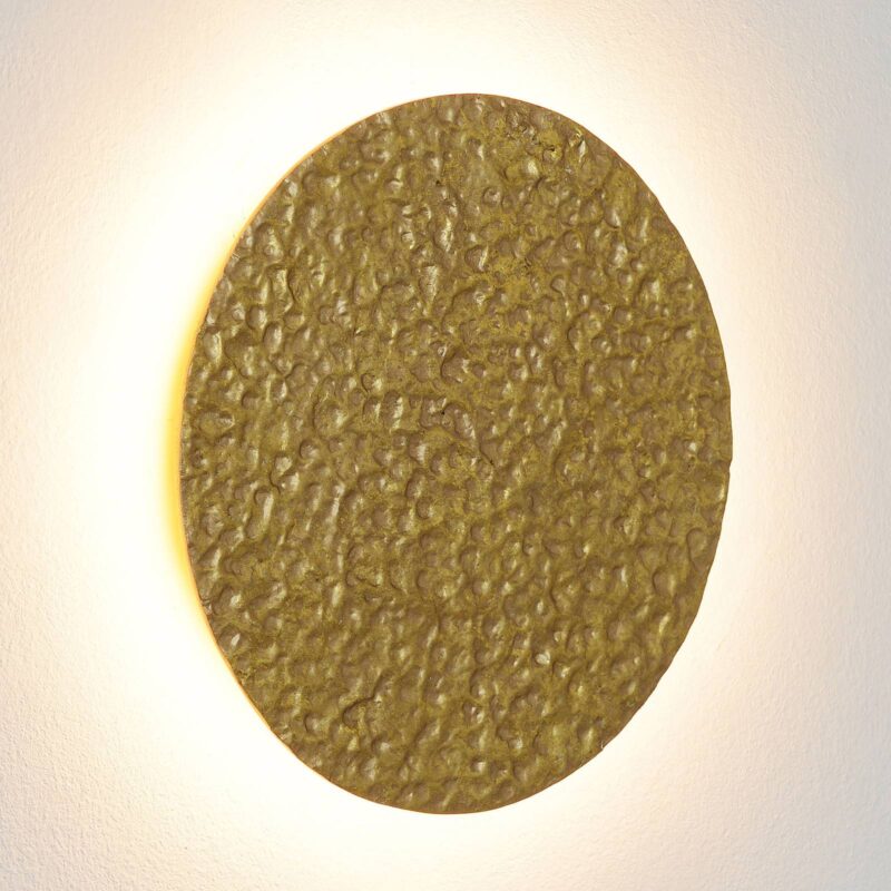 Tajomne vyzerajúce nástenné svietidlo LED Meteor: povrch v zlatej farbe s kladivkovým povrchom Keď je nástenné svietidlo LED Meteor zapnuté, zabudovaný pás LED vytvára okolo okrúhleho tela svietidla tajomnú auru. Meteor svieti ako súčasť vesmíru a dodáva každej miestnosti dekoratívny akcent a atmosférické dodatočné svetlo. Nástenné svietidlo s modernou technológiou osvetlenia a dekoratívnym vzhľadom, ktoré obohatí širokú škálu možností interiérového dizajnu. Nástenné svietidlo Meteor LED je vhodné aj na montáž na strop.