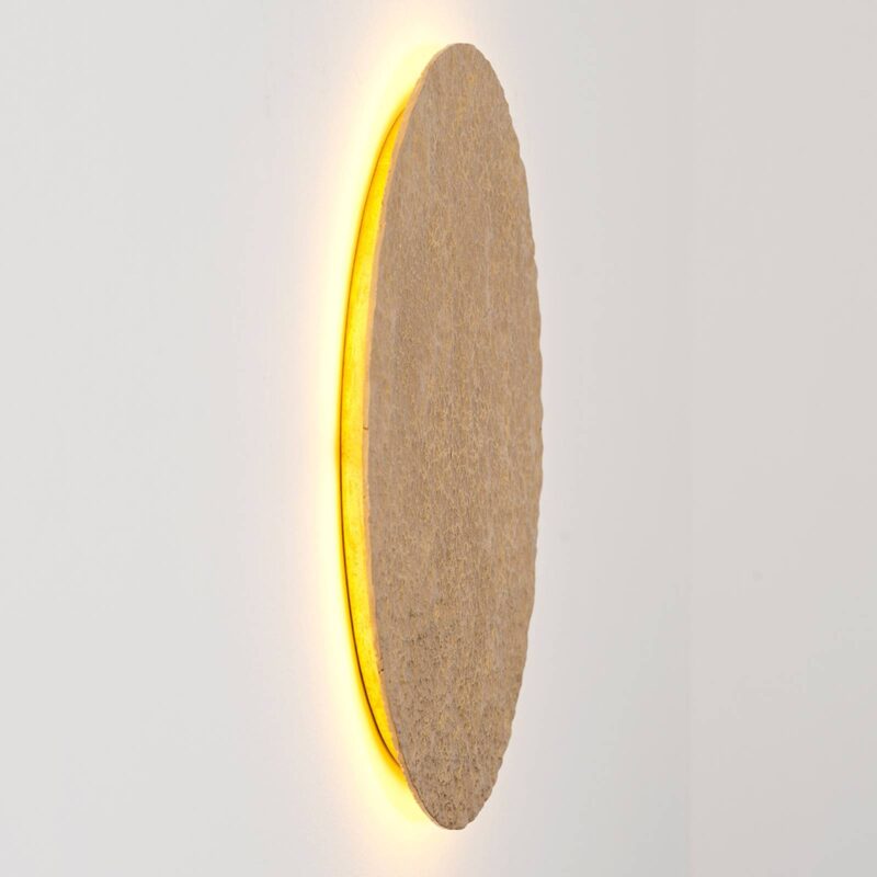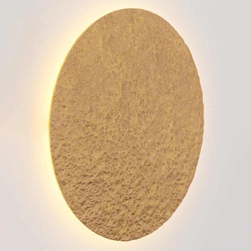 Meteor – zlaté nástenné LED svietidlo s priemerom 55 cm Nástenné LED svietidlo Meteor ako planéta bolo zhotovené z okrúhleho železa s nepravidelne štruktúrovaným povrchom, ktorý naozaj vyzerá ako krajina posiata krátermi. Teplé biele LED boli osadené po okraji za platňou a vytvárajú na stene veniec svetla a útulné osvetlenie miestnosti. S nástenným LED svietidlom Meteor získate nielen útulné osvetlenie, ale aj nápadnú dekoráciu steny. Štruktúra povrchu každého jedného svietidla je iná, čím sa každé z nich stáva jedinečným.