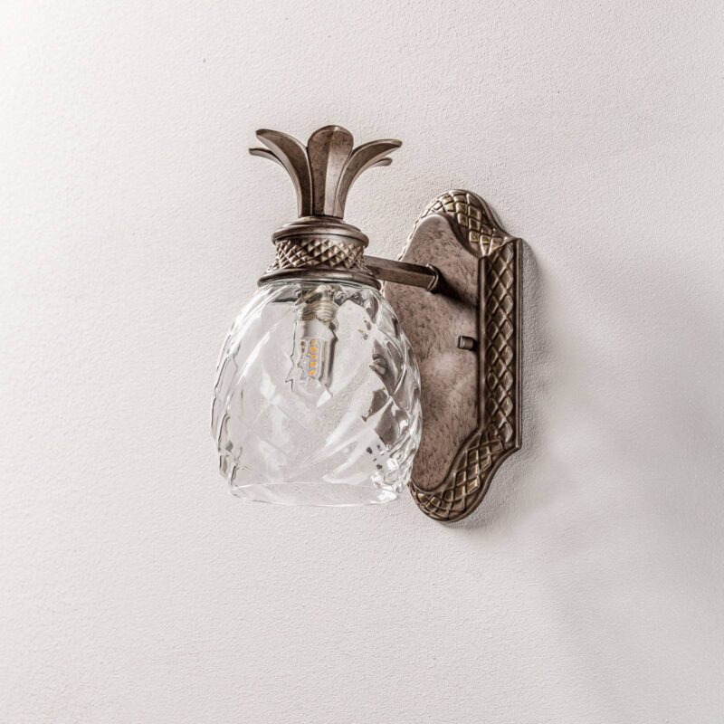 LED kúpeľňové nástenné svetlo v tvare ananásu Plantation Optika nástenného kúpeľňového svietidla LED Plantation kombinuje tradičné vplyvy ovplyvnené vintage dizajnom aj súčasné vplyvy a vďaka svojmu ovocnému tvaru vyzerá na každom mieste veľmi exoticky. Číre štruktúrované sklo vyžaruje svetlo z LED svetelného zdroja použitého všade naokolo. Potrebný vymeniteľný svetelný zdroj LED s päticou G9 je už súčasťou dodávky. – Odolné proti striekajúcej vode s triedou ochrany IP44