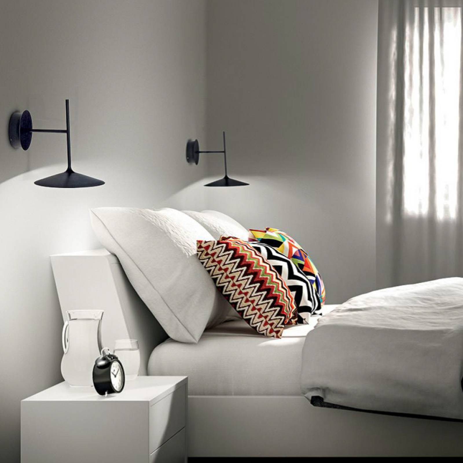 Nástenné svietidlo Poe Plus LED – tienidlo možno orientovať smerom nahor alebo nadol Nástenné svietidlo Poe Plus LED má puristický a moderný vzhľad. Skladá sa z plochého lievikovitého tienidla, ktoré drží vertikálna a horizontálna tyč. Svietidlo možno namontovať tak, aby tienidlo smerovalo buď nadol, alebo nahor. Možno ho preto použiť na útulné nepriame osvetlenie v obývacej izbe, ako aj na priame osvetlenie príručného stolíka umiestneného pri stene. Integrované LED diódy sú energeticky úsporné a zároveň výkonné. Svoje teplé svetlo vyžarujú rovnomerne do miestnosti cez polykarbonátový kryt.