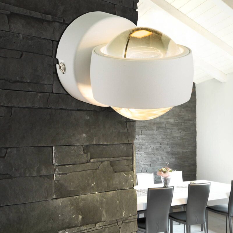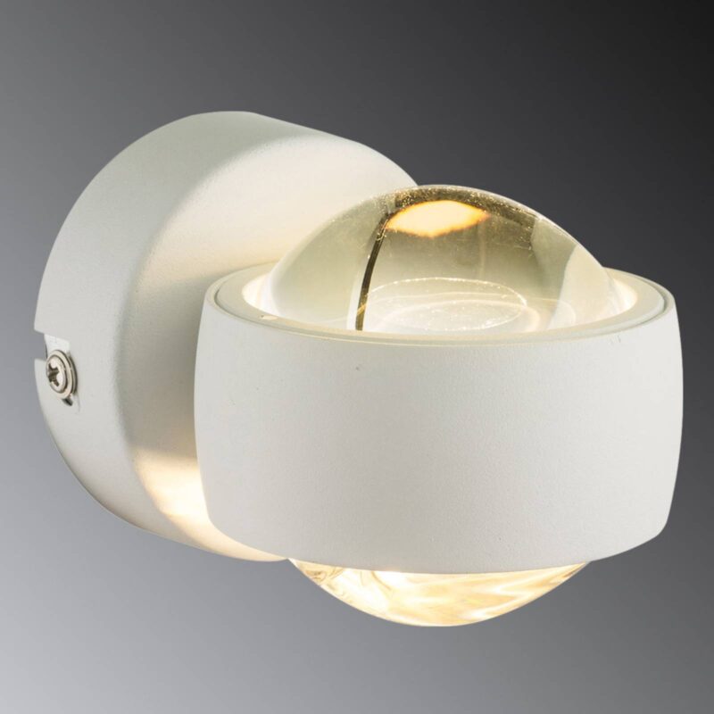 Moderné nástenné LED svietidlo Randi pre pôsobivé efekty S bielym kovovým rámom sa nástenné LED svietidlo Randi decentne postará o efektné osvetlenie. Táto malá lampa je moderná a má univerzálne použitie. Teplé biele svetlo vyžaruje cez sklenenú guľu nahor a nadol a cielene tak osvetľuje určité časti miestnosti, schody alebo haly. Toto nástenné svietidlo sa nenápadne a šikovne začlení do moderného a jasného interiéru. Svojím harmonickým svetlom, ktoré vychádza cez dve sklenené šošovky obohatí vo večerných hodinách celú miestnosť. Vďaka zabudovanej LED technológii je aj trvalé používanie výnimočne energeticky úsporné.