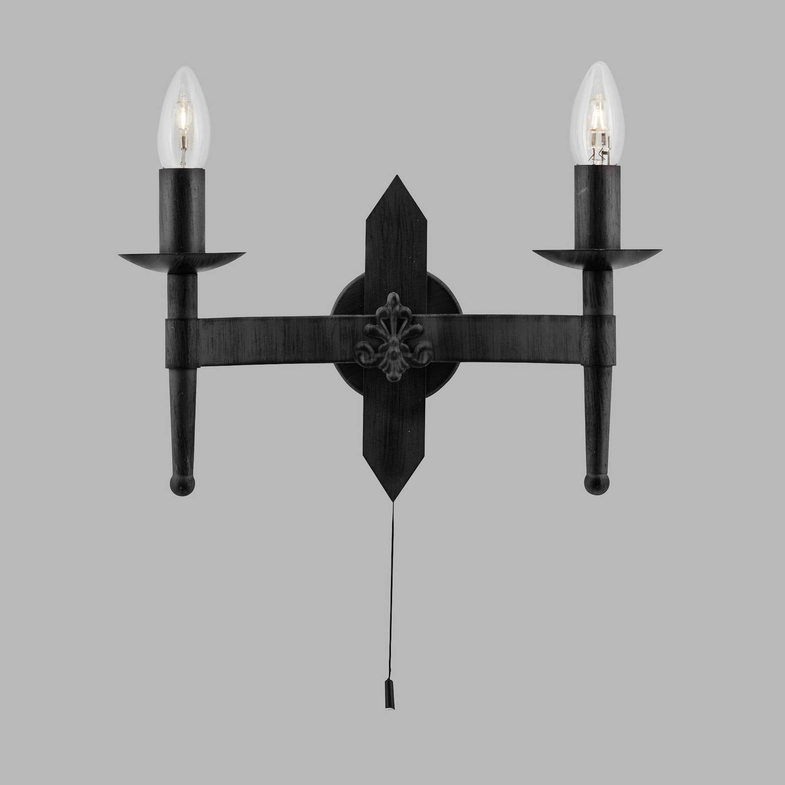 Dvojsvetelné nástenné svietidlo Cartwheel II z tepaného železa Nástenné svietidlo Cartwheel II je vyrobené v starom anglickom štýle. Nástenné svietidlo s tepaným železným rámom so starožitným dekorom a dvoma zásuvkami na sviečky vizuálne evokuje spomienky na svietnik zo stredoveku. Doplnok v starožitnom štýle vybavený modernou osvetľovacou technikou sa výborne hodí na akcentové osvetlenie obývacích izieb, spální a chodieb. – vybavené ťahovým spínačom
