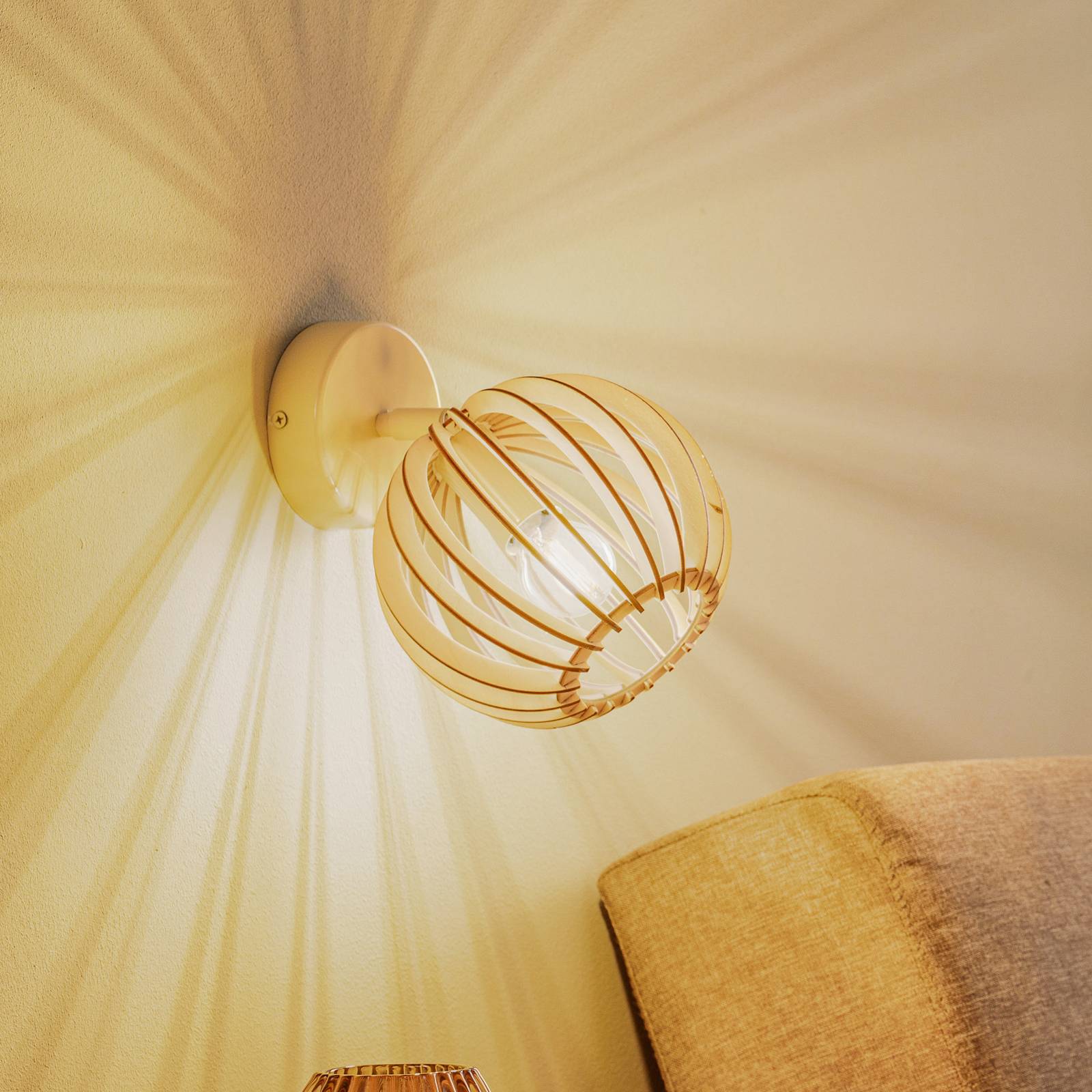 Nástenné svetlo Paz biele s drevenými lamelami a guľatým tienidlom