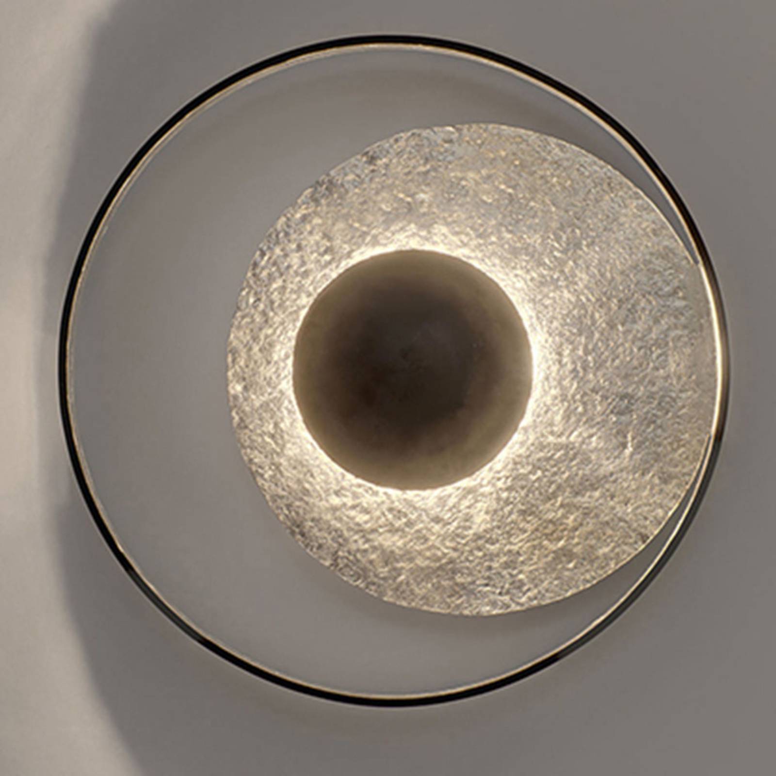 Nástenné svietidlo striebornej farby Satelit s nepriamym vyžarovaním svetla Nástenné svietidlo Satellite vizuálne pripomína priestor s planétami a ich obežnou dráhou. Na úzkom vonkajšom železnom prstenci je pripevnený veľký lakovaný železný disk striebornej farby so štyrmi objímkami pre žiarovky, ktoré sú zakryté malým železným diskom čiernej farby, takže emitované svetlo sa nepriamo dostáva do okolia. Takto je nepriamo osvetlené aj samotné nástenné svietidlo. Satelit bol vyrobený ručne, takže každá lampa je jedinečný kúsok.