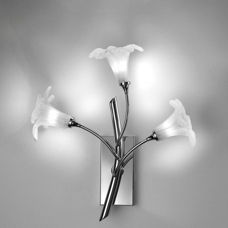 Trojité nástenné svietidlo 7142 s čírymi sklami a chrómovou Basis Nástenné svietidlo 7142 vyzerá, keď nie je osvetlené, skôr ako dekoratívny predmet ako zdroj svetla. Môže za to dekoratívny kvetinový dizajn: sklenené tienidlá majú tvar kalichov, ramená žiarovky sú navzájom rozvetvené ako stonky vo váze. Výsledkom rozloženia svietidiel je osvetlenie, ktoré svieti doľava, doprava aj hore. Číre okuliare tiež zaisťujú, že na stene vznikne pekný svetlý a tieňový obraz.