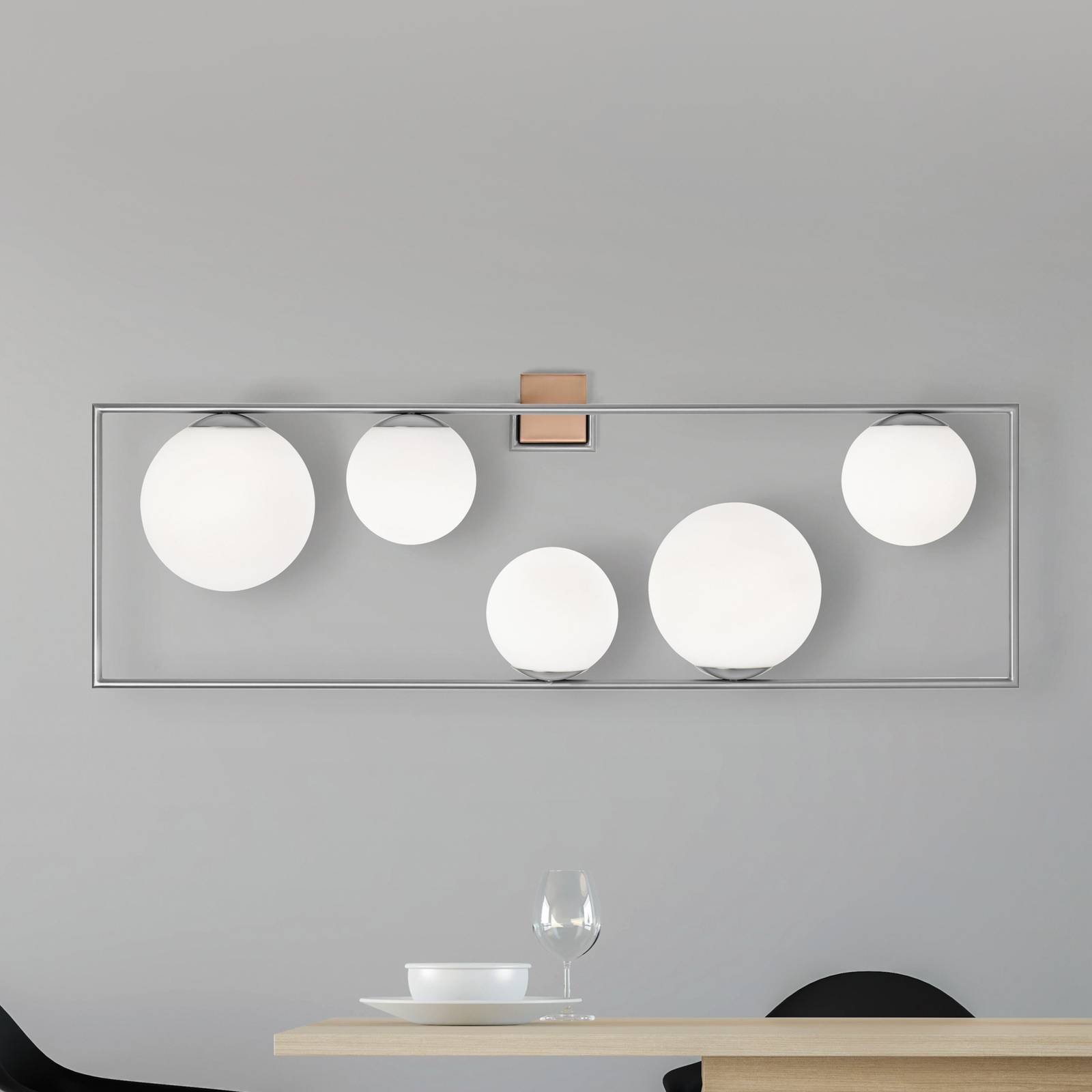 Nástenné svietidlo Buble s povrchovou úpravou z brúsenej ocele a piatimi guľami z opálového skla Séria svietidiel Buble, ktorú vytvoril taliansky architekt a dizajnér Davide Negri, sa vyznačuje rôzne veľkými guľovitými tienidlami z opálového skla, ktoré sú umiestnené v obdĺžnikovom kovovom ráme. Toto nástenné svietidlo je vybavené piatimi tienidlami, z ktorých každé obsahuje objímku a poskytuje mäkké svetlo zo všetkých strán. Kovový rám a štvorcová nástenná montáž majú povrchovú úpravu z brúsenej ocele.