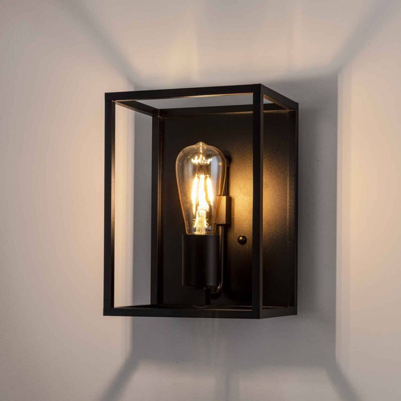 Čierne lakované mosadzné nástenné svetlo Cubic³ s jasnými líniami Pre tých, ktorí majú radi niečo špeciálne, je obdĺžnikové nástenné svietidlo Cubic³ to pravé. Svietidlo vyrobené z robustnej mosadze zapadá do mnohých možností vybavenia vďaka svojej čiernej povrchovej úprave. Do objímky namontovanej v strede rámu môžu byť zapojené všetky typy žiaroviek E27. Pretože pohľad na použitú lampu zostáva neobmedzený, je vhodné použiť dekoratívnu lampu, ako napr. B. vlákno alebo rustikálna žiarovka, ktorá spadne späť.