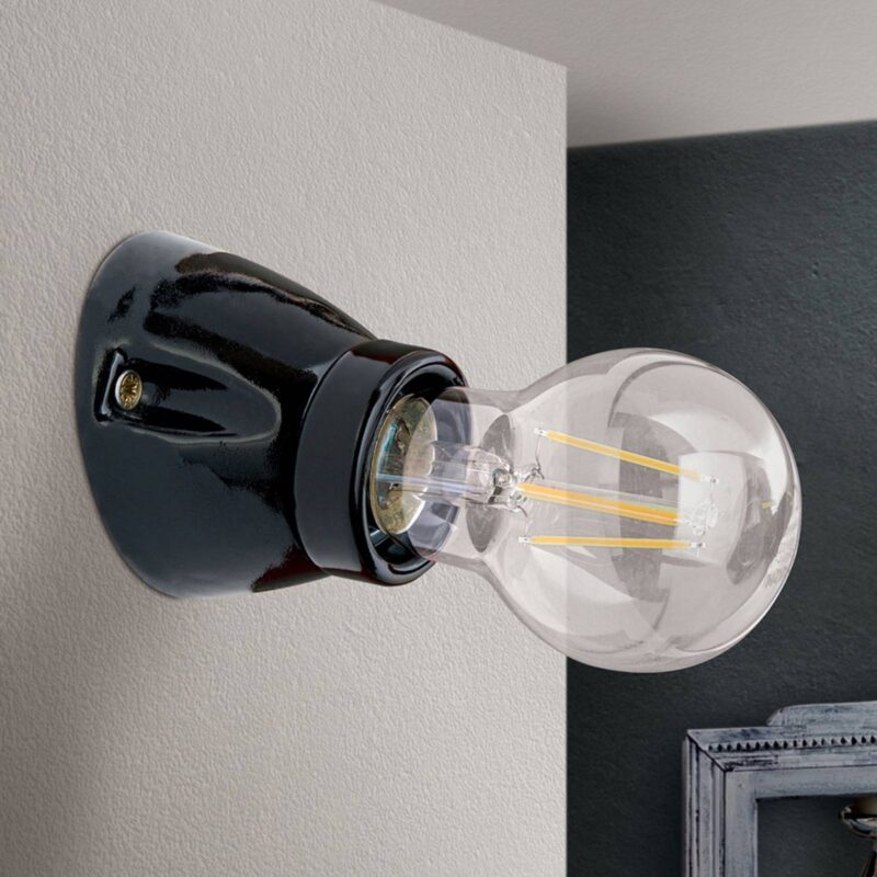 Svetlo s keramickou objímkou Frost – na montáž na stenu alebo strop (uhol: 45°) Nástenné svetlo Frost je malý, ale o to účinnejší doplnok osvetlenia pre interiéry v retro štýle. Pozostáva jednoducho z nástenného držiaka z glazovanej keramiky, do ktorého bola zabudovaná objímka E27. Možno použiť svetelné zdroje (vrátane LED) s maximálnym výkonom 60 W. Najlepšie vyzerá, keď sa použijú retrofitné žiarovky v rustikálnom dizajne, ako je znázornené na obrázku. Svetelný zdroj nie je súčasťou dodávky. Vhodné žiarovky sú k dispozícii ako príslušenstvo – externe stmievateľné