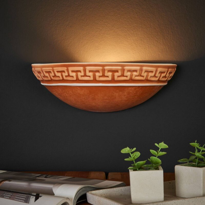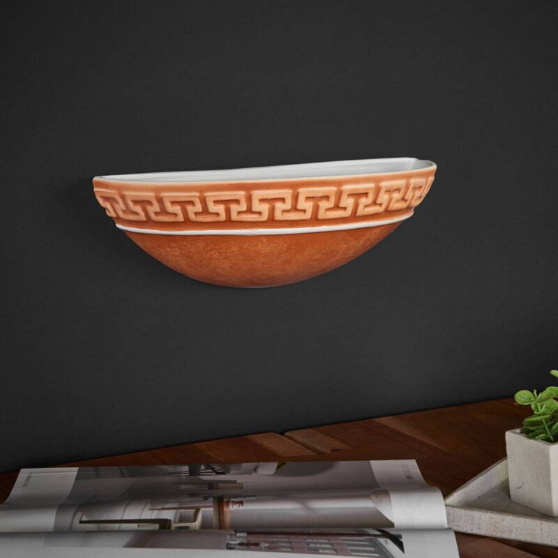 Nástenná lampa Greca Mediterraneo vnáša do obývačky stredomorskú atmosféruNástenná lampa Greca Mediterraneo je vyrobená z keramiky a svojím polkruhovým tienidlom imituje stredomorský terakotový štýl. Tienidlo má starožitné ornamentálne lemovanie. Svetlo svieti smerom nahor do miestnosti a vytvára príjemnú svetelnú atmosféru. Svietidlá od tohto výrobcu sú ručne maľované, preto sa môžu vyskytnúť mierne odchýlky vo vzore a farebnosti. Nie je to však chyba kvality, ale znak jedinečnosti, ktorú dokáže vytvoriť len ručná výroba.